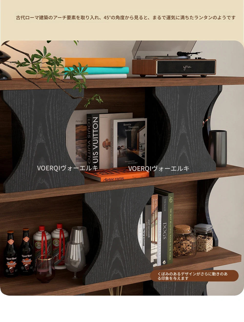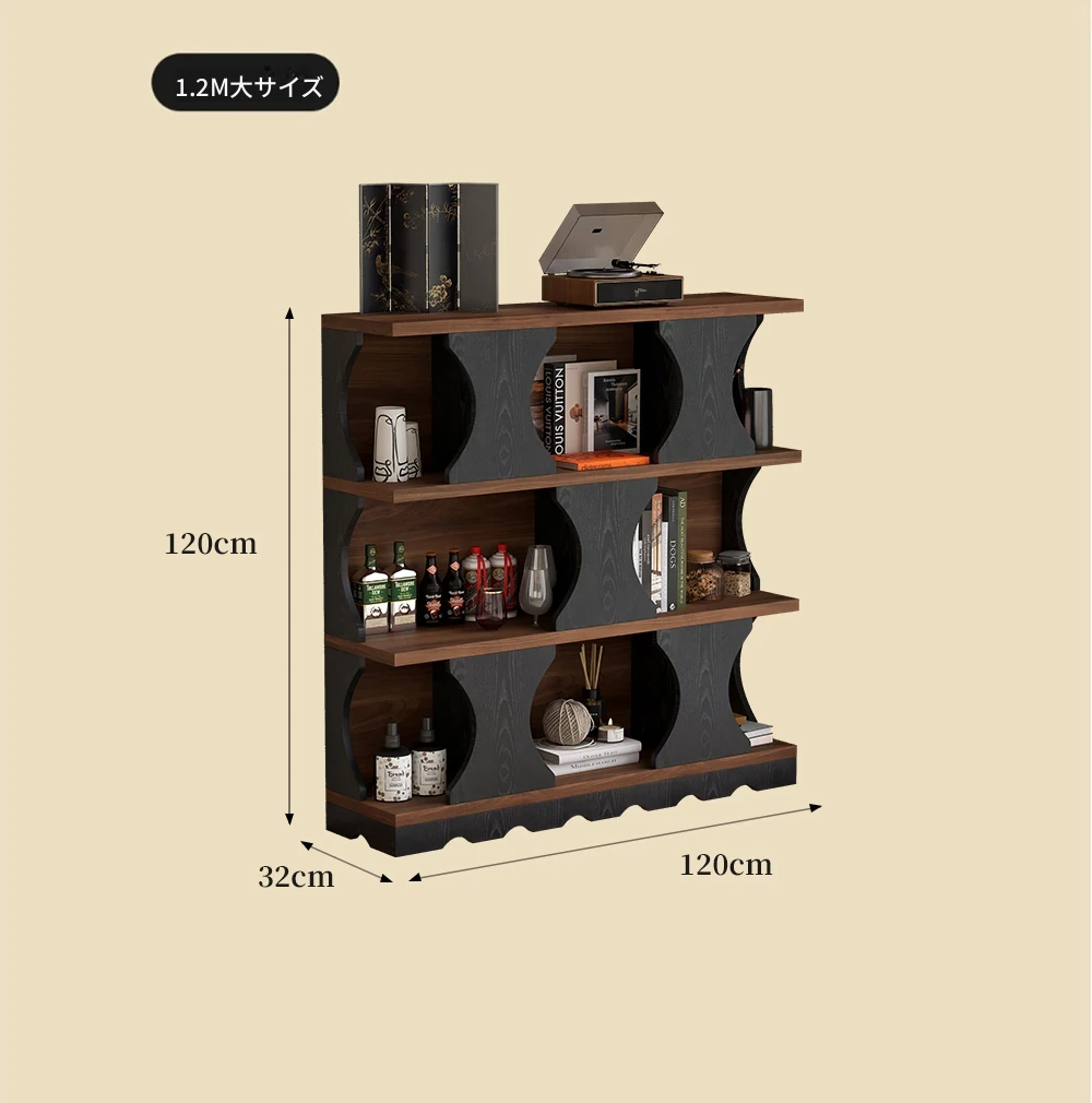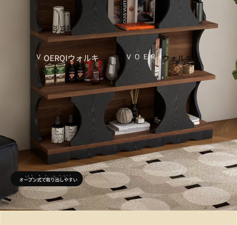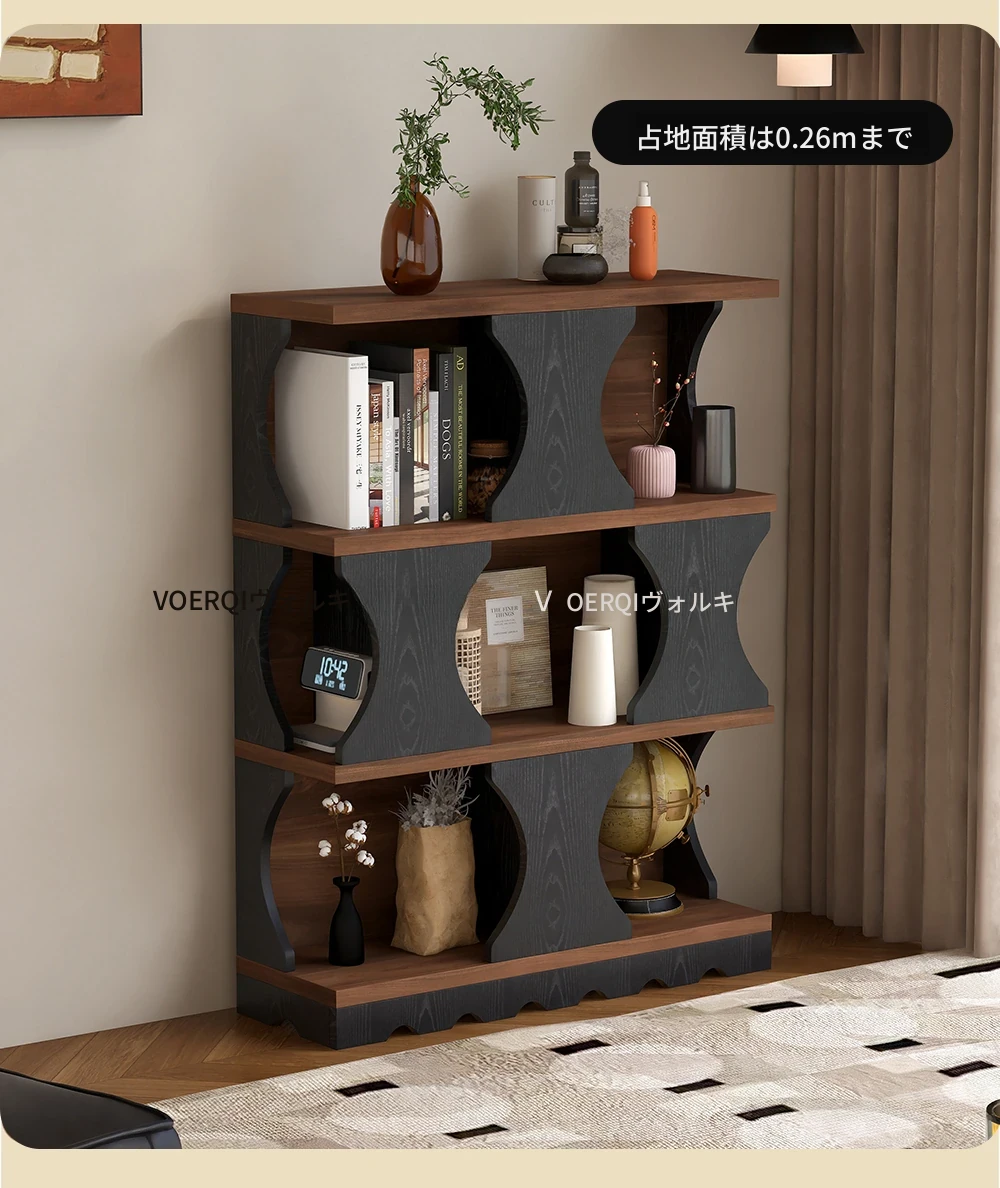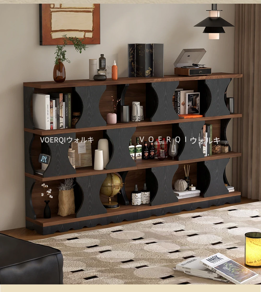 ウォルキ古風スタイルの無垢材ハリー書棚、リビングルーム用収納サイドキャビネット、ウォールナット色のレトロアーチ型ワインキャビネットコンビネーションキャビネットで、魅力的なインテリアを演出!