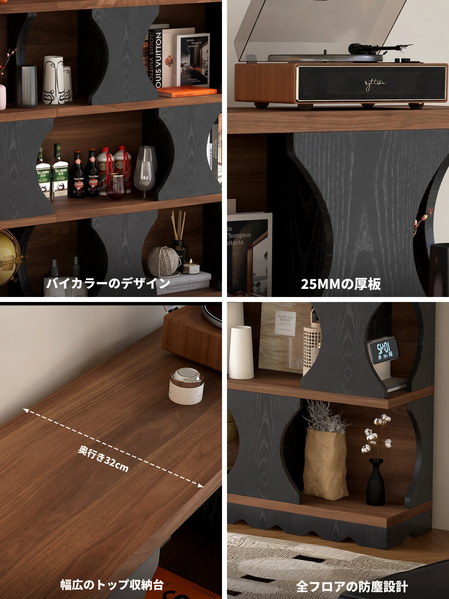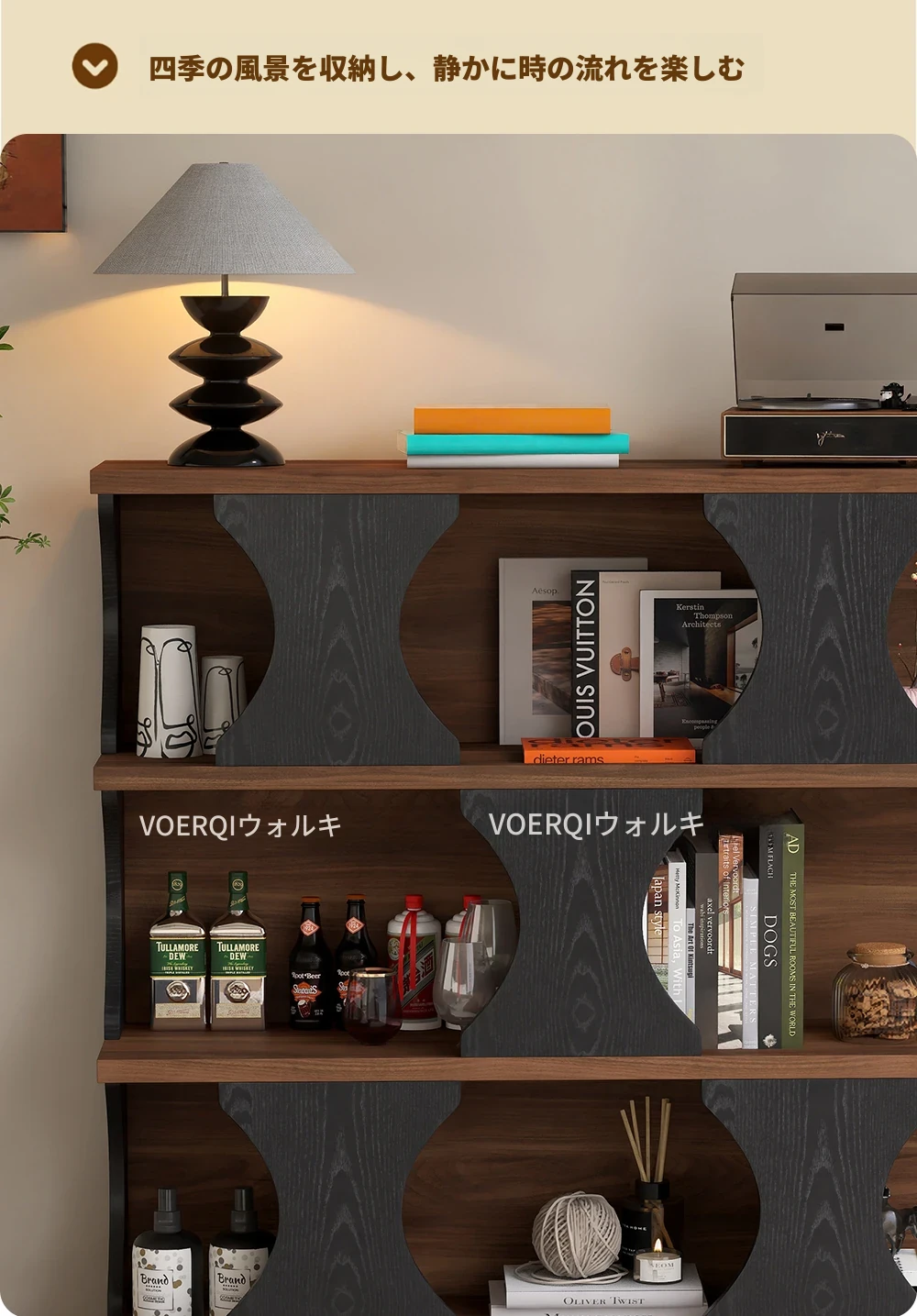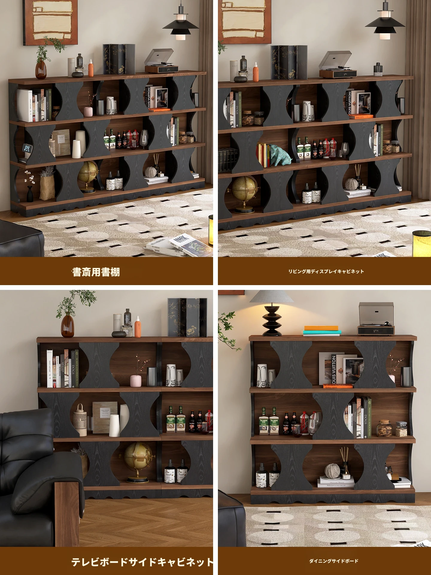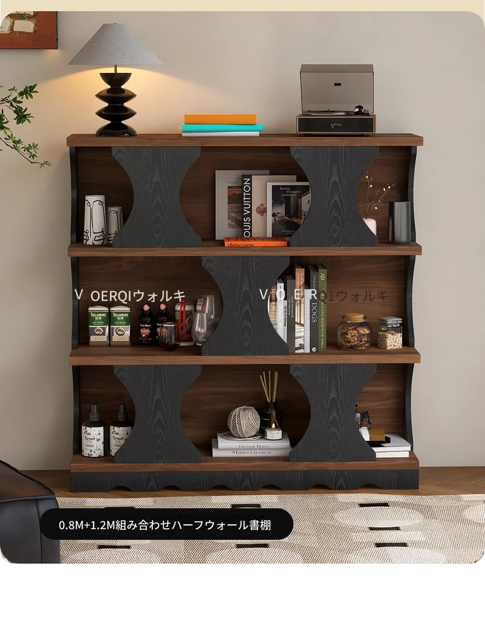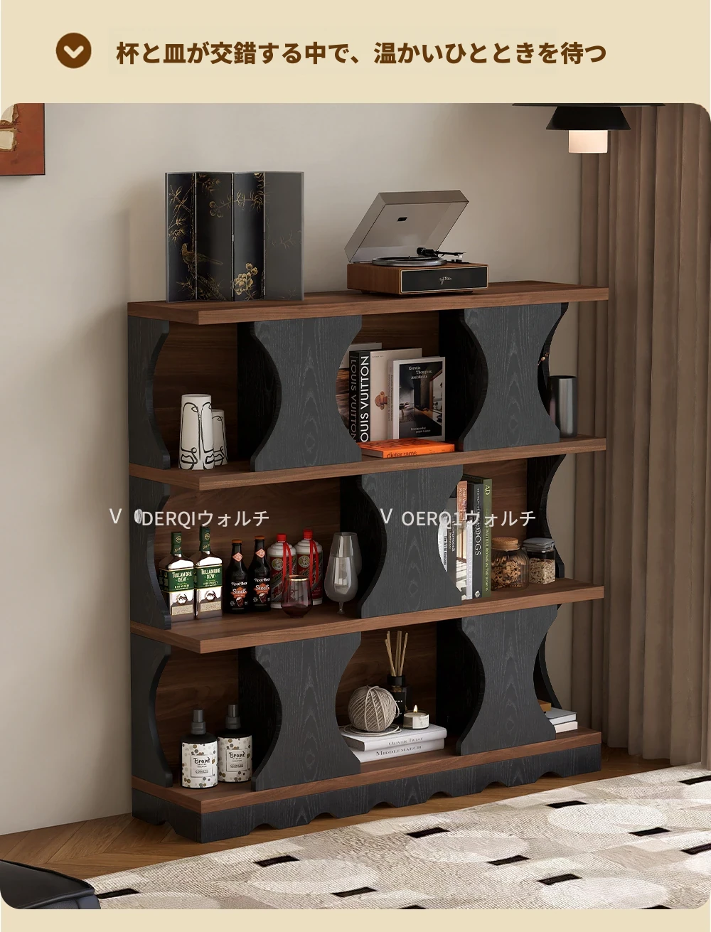 ウォルキ古風スタイルの無垢材ハリー書棚、リビングルーム用収納サイドキャビネット、ウォールナット色のレトロアーチ型ワインキャビネットコンビネーションキャビネットで、魅力的なインテリアを演出!
