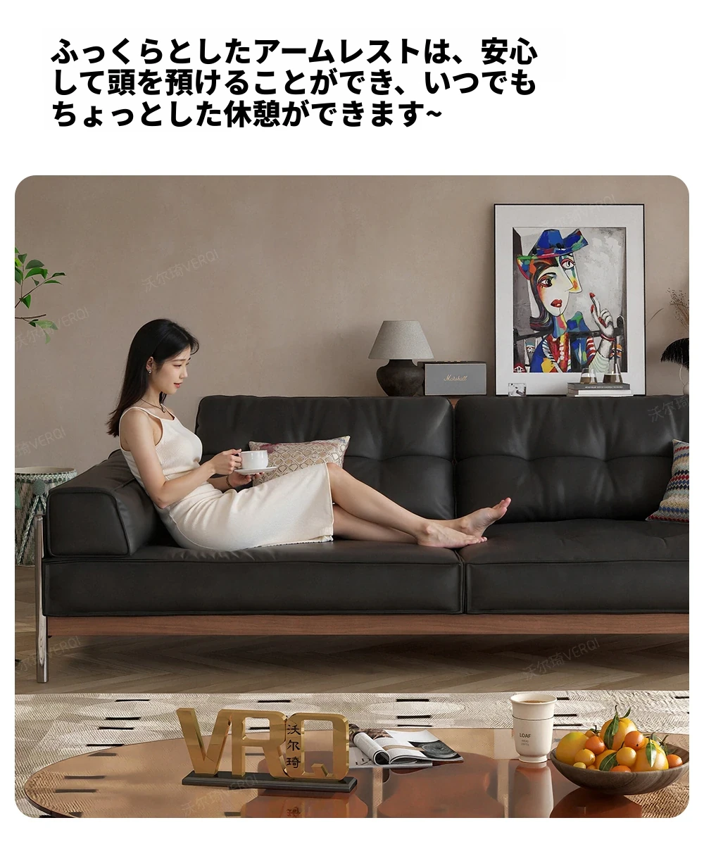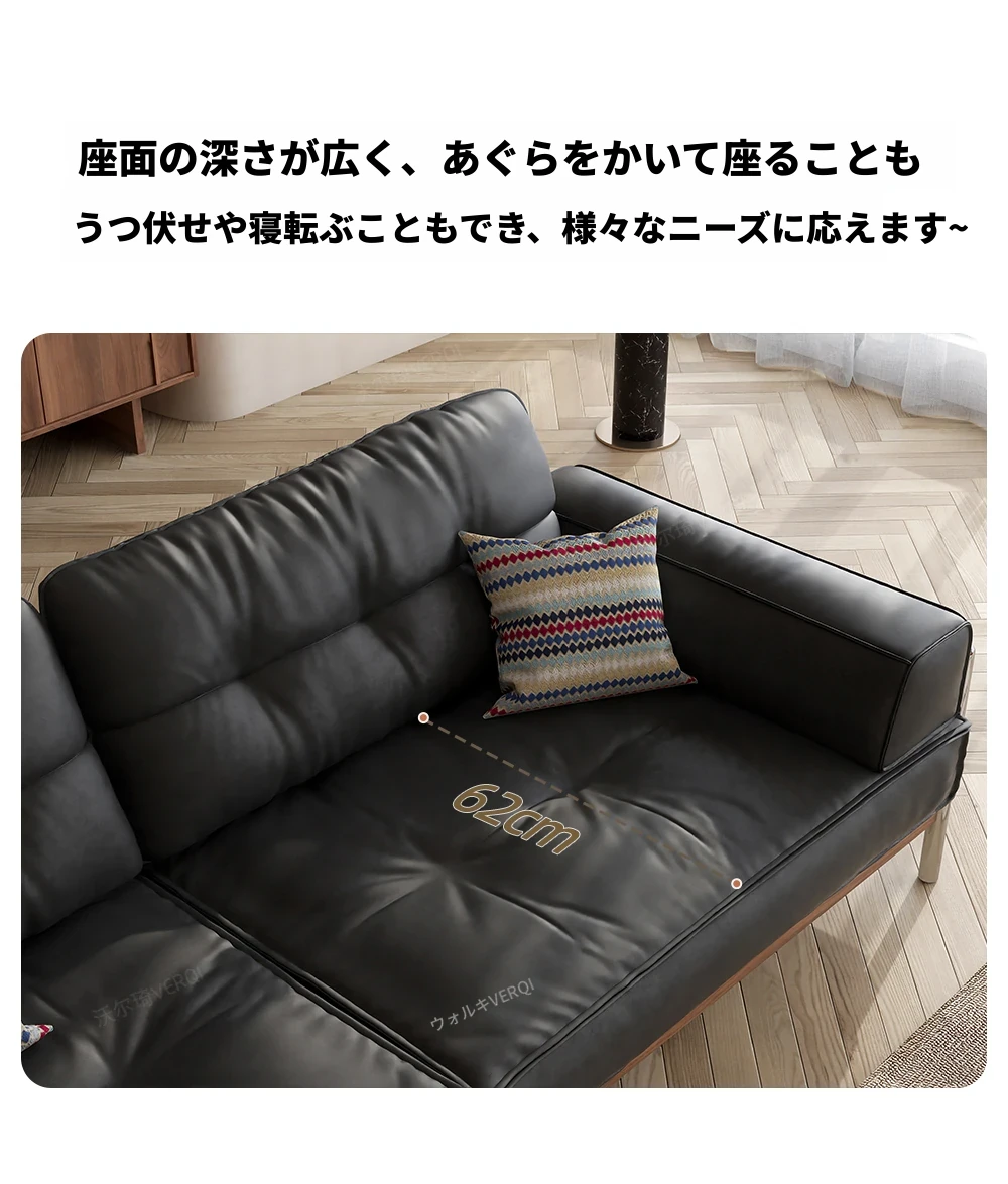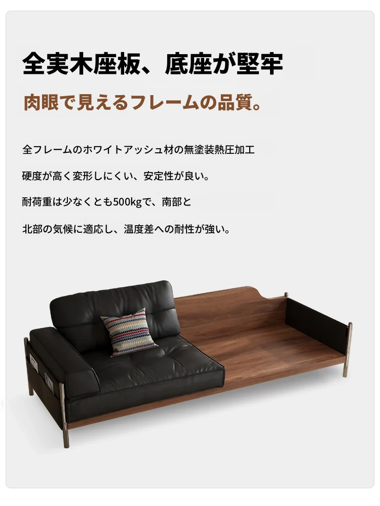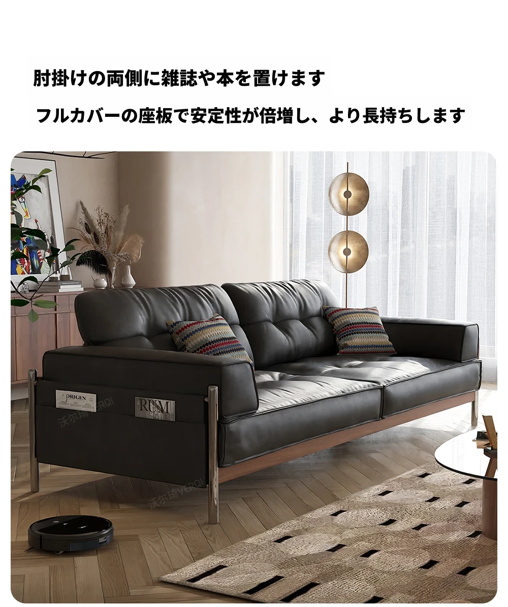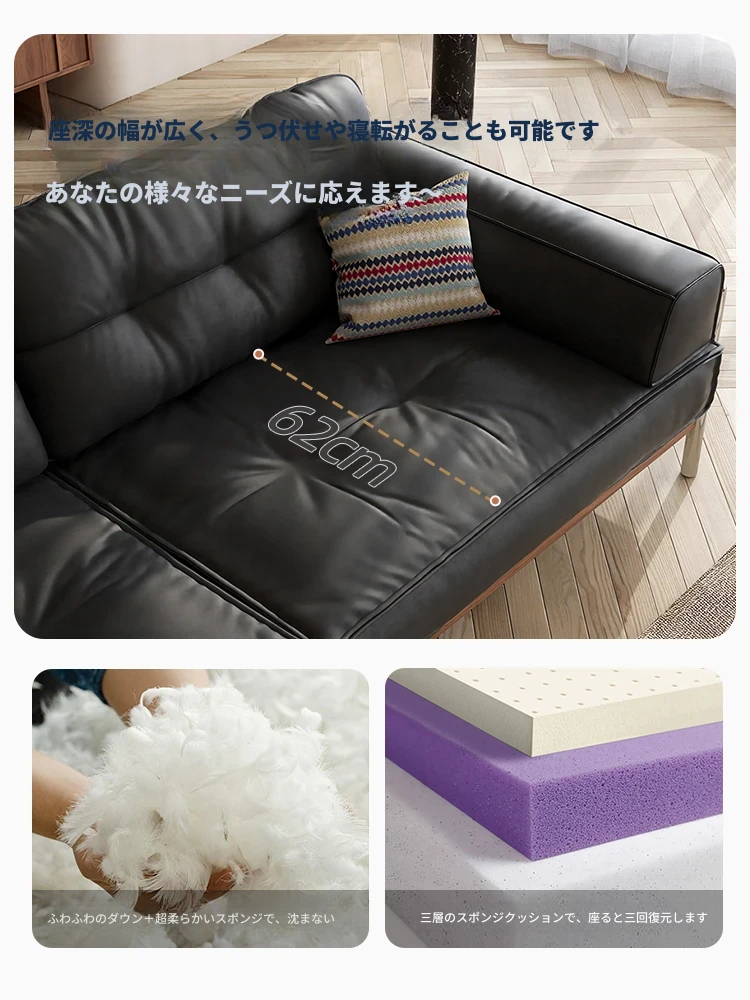 ウォルキ 中古風実木真皮ソファ 小型フレンチレトロリビング ブラックストレートバウハウスソファ - 高級感溢れるデザインで狭い空間もお洒落に演出!
