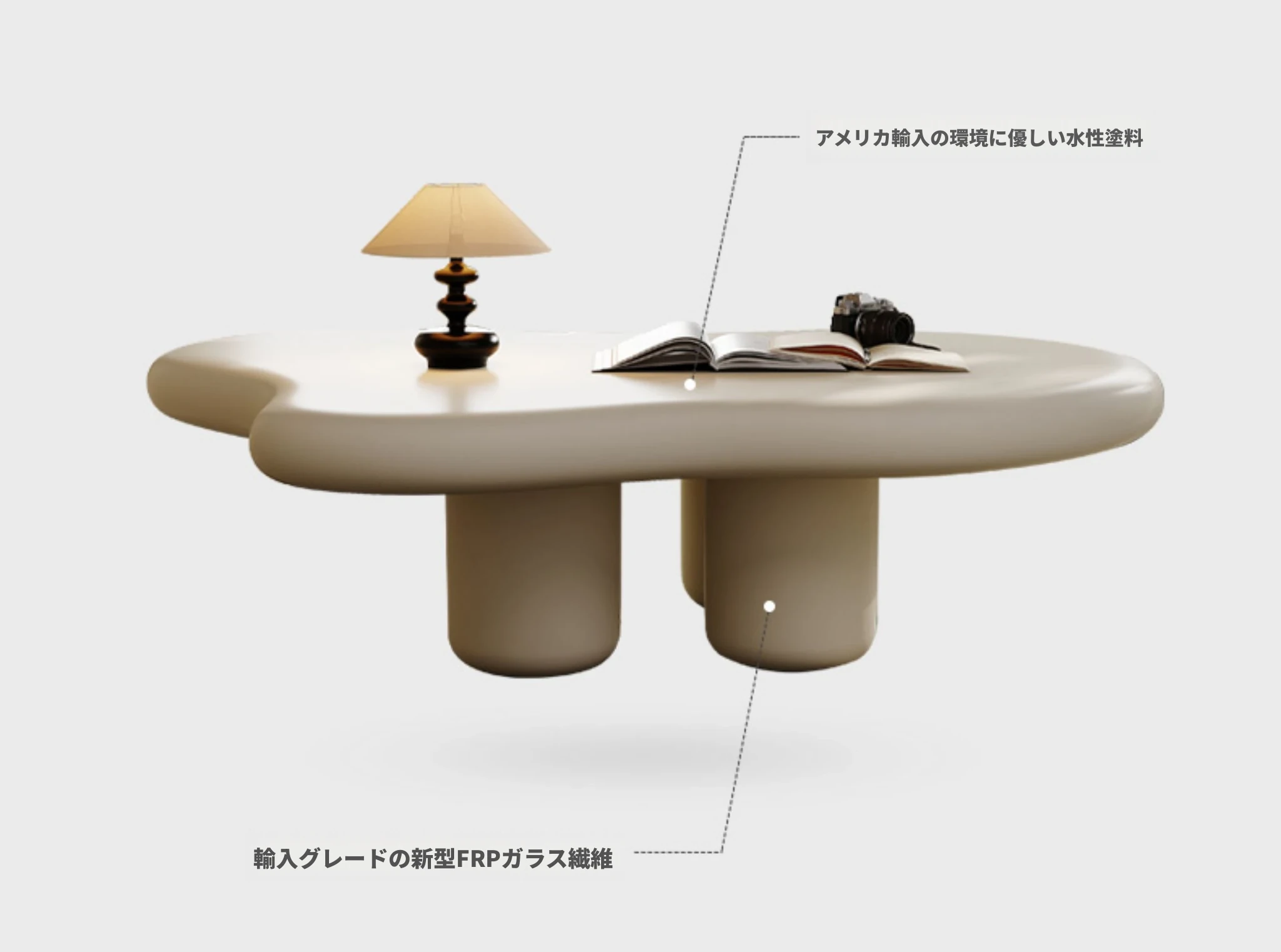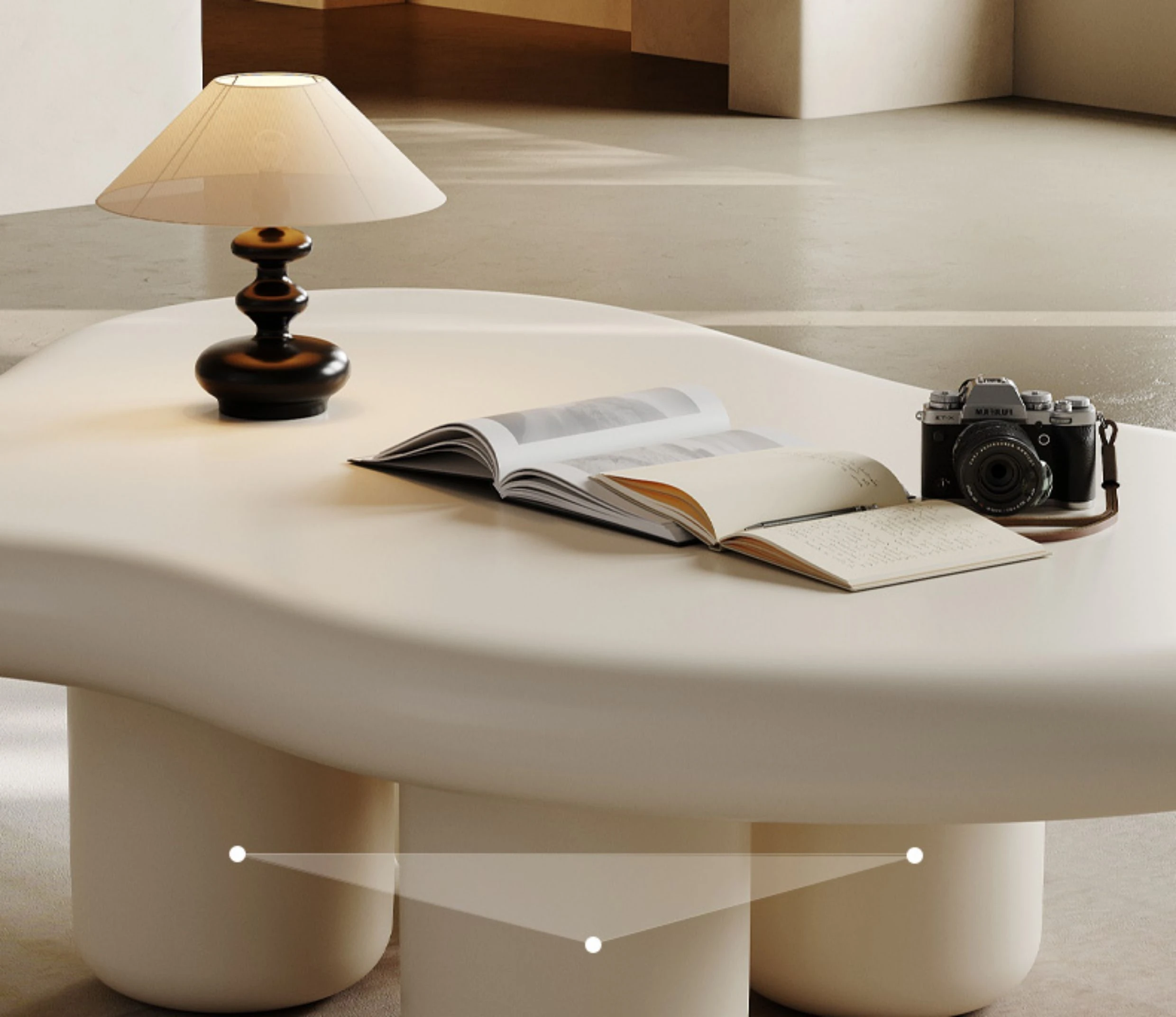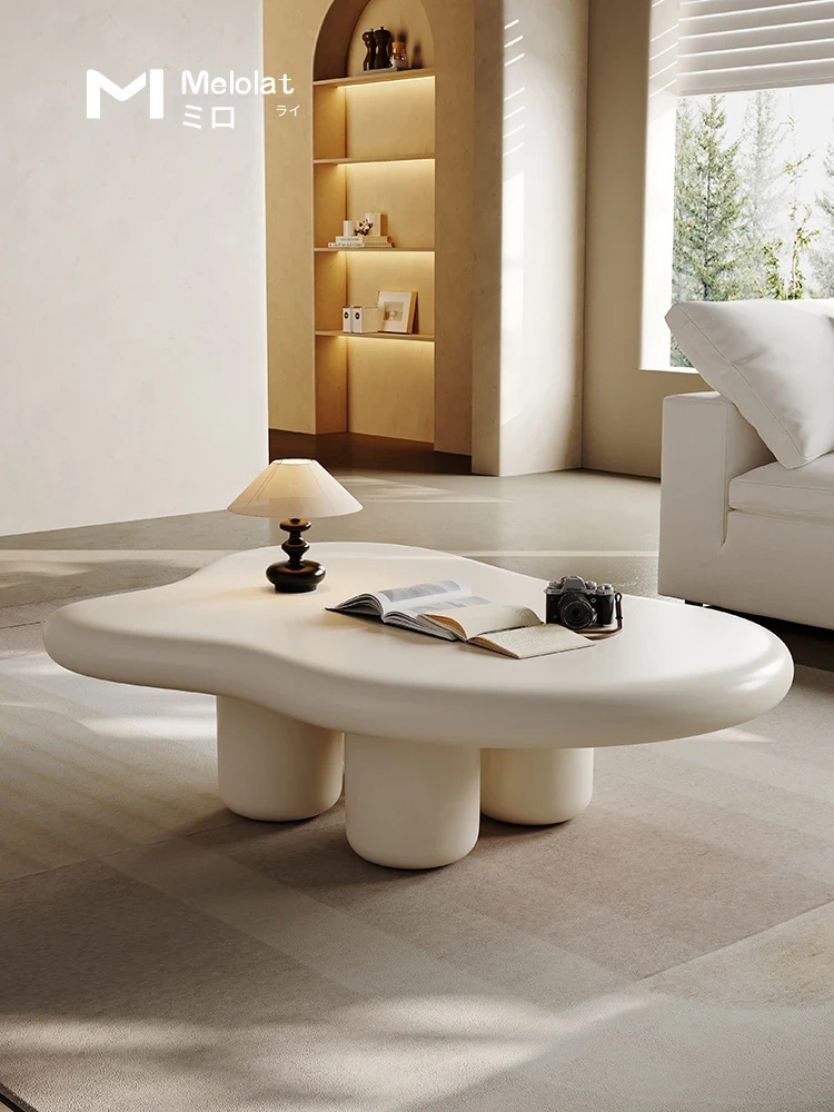 侘寂スタイルのガラス繊維製雲型コーヒーテーブル - 北欧風、クリーム色のシンプルでモダンなデザイン、小さなスペースに最適なリビングルーム用テーブル。おしゃれで機能的、インテリアにぴったり!