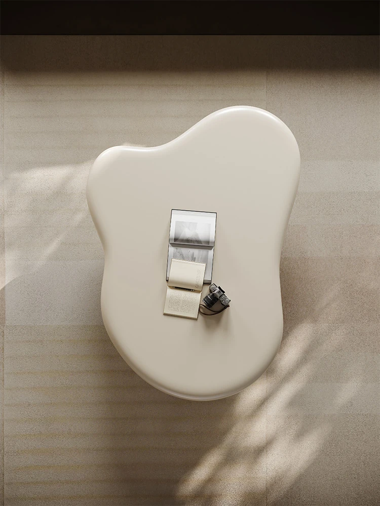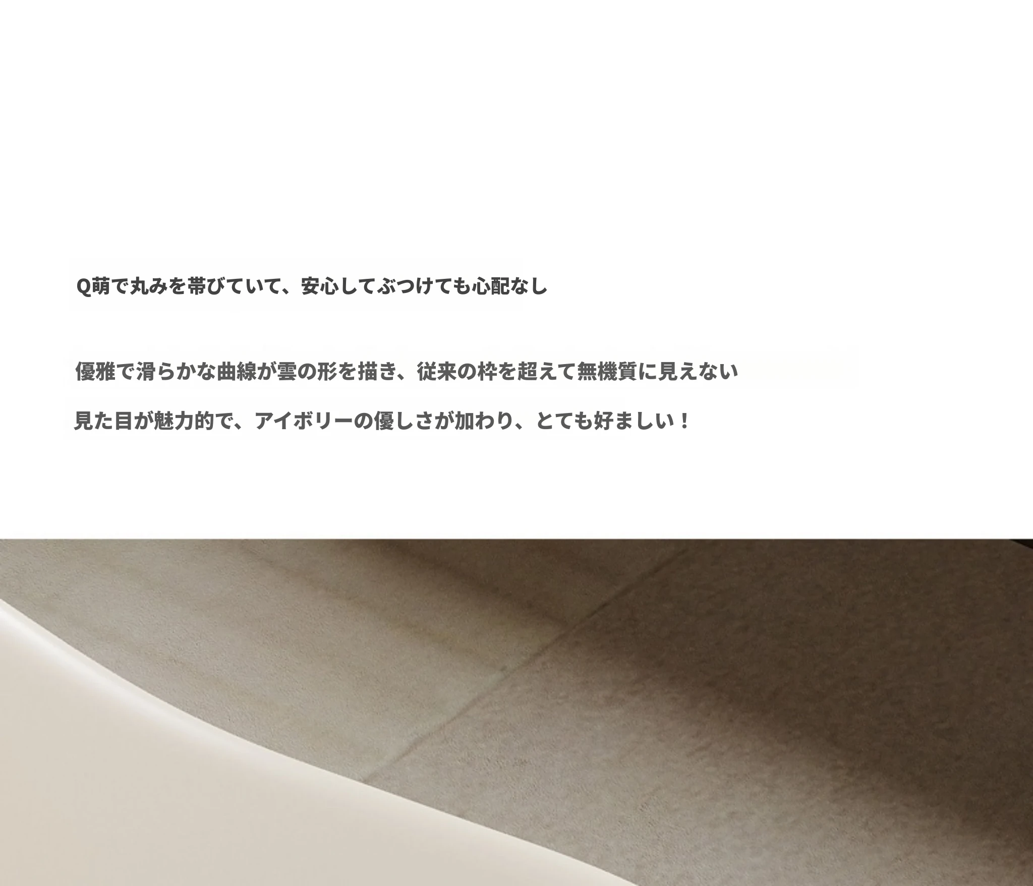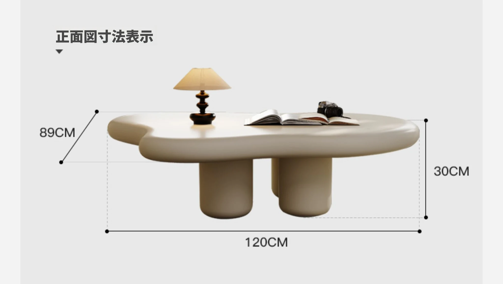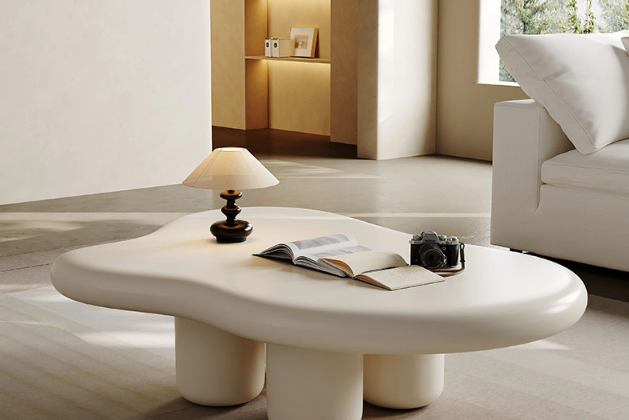 侘寂スタイルのガラス繊維製雲型コーヒーテーブル - 北欧風、クリーム色のシンプルでモダンなデザイン、小さなスペースに最適なリビングルーム用テーブル。おしゃれで機能的、インテリアにぴったり!
