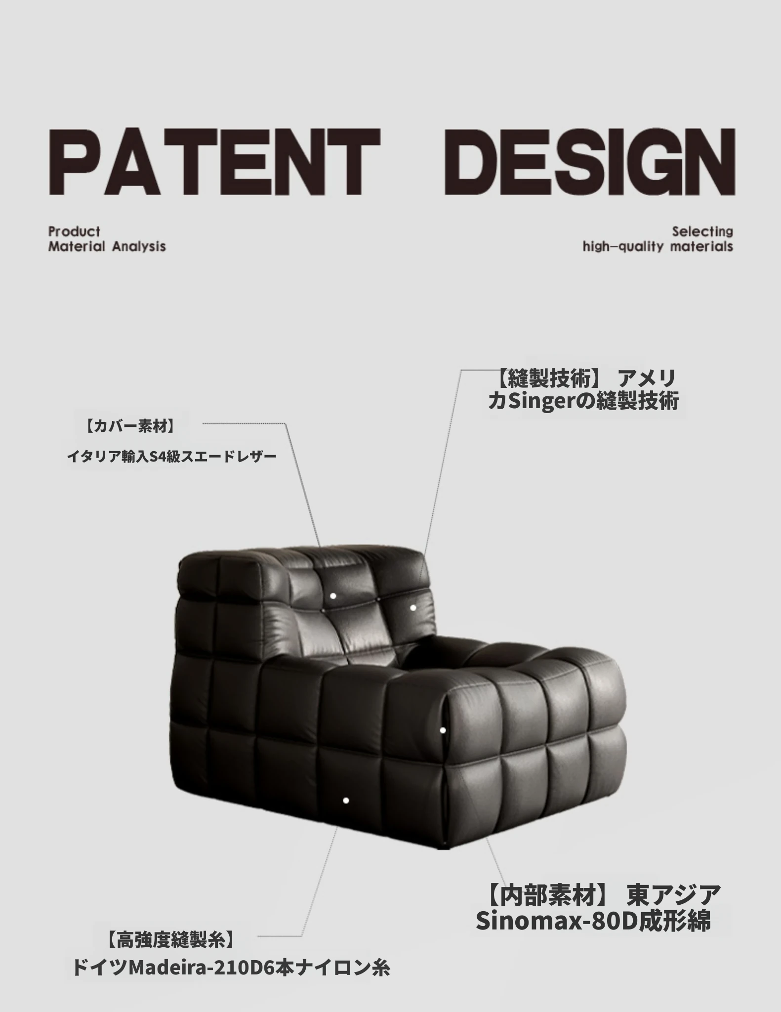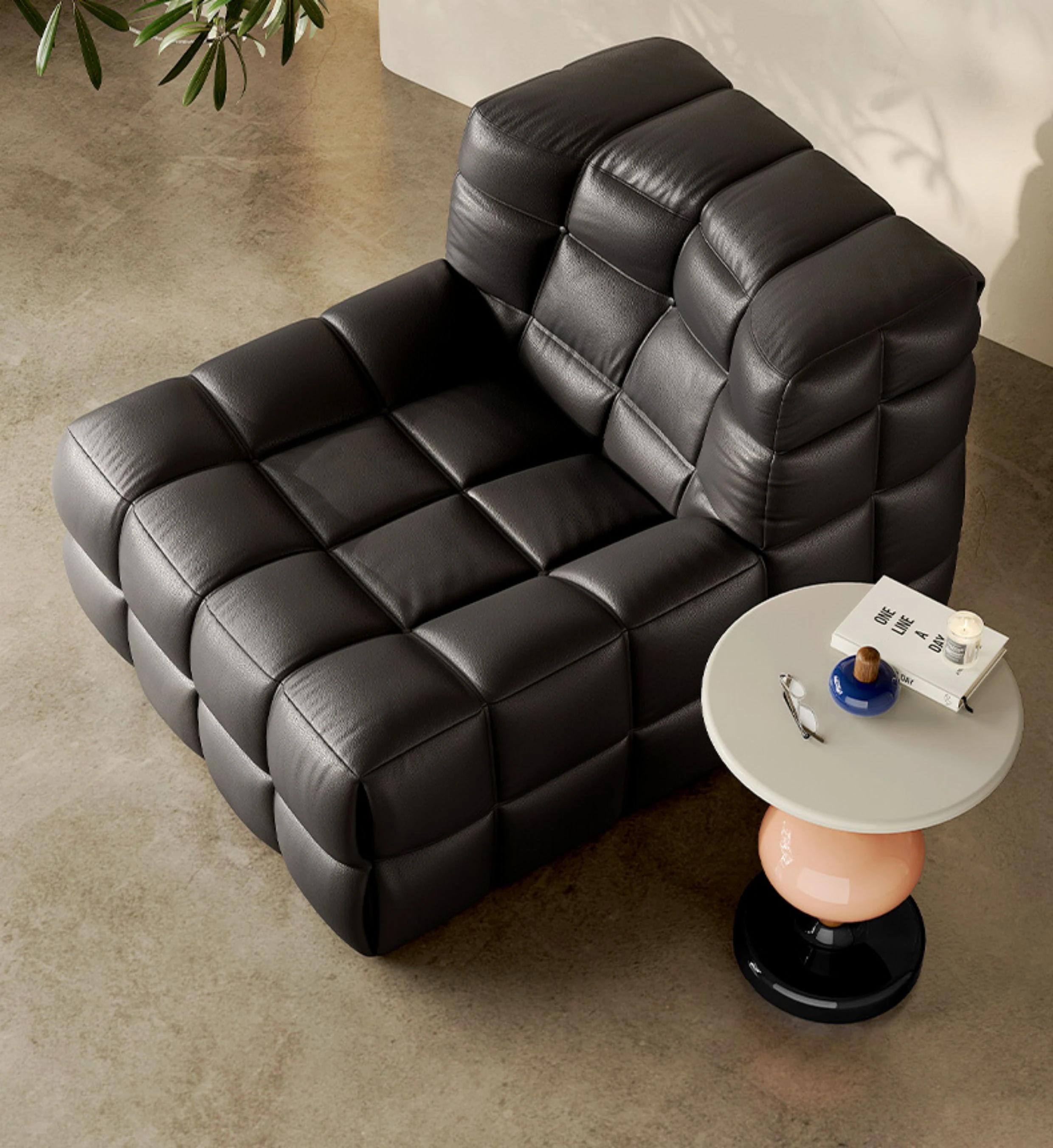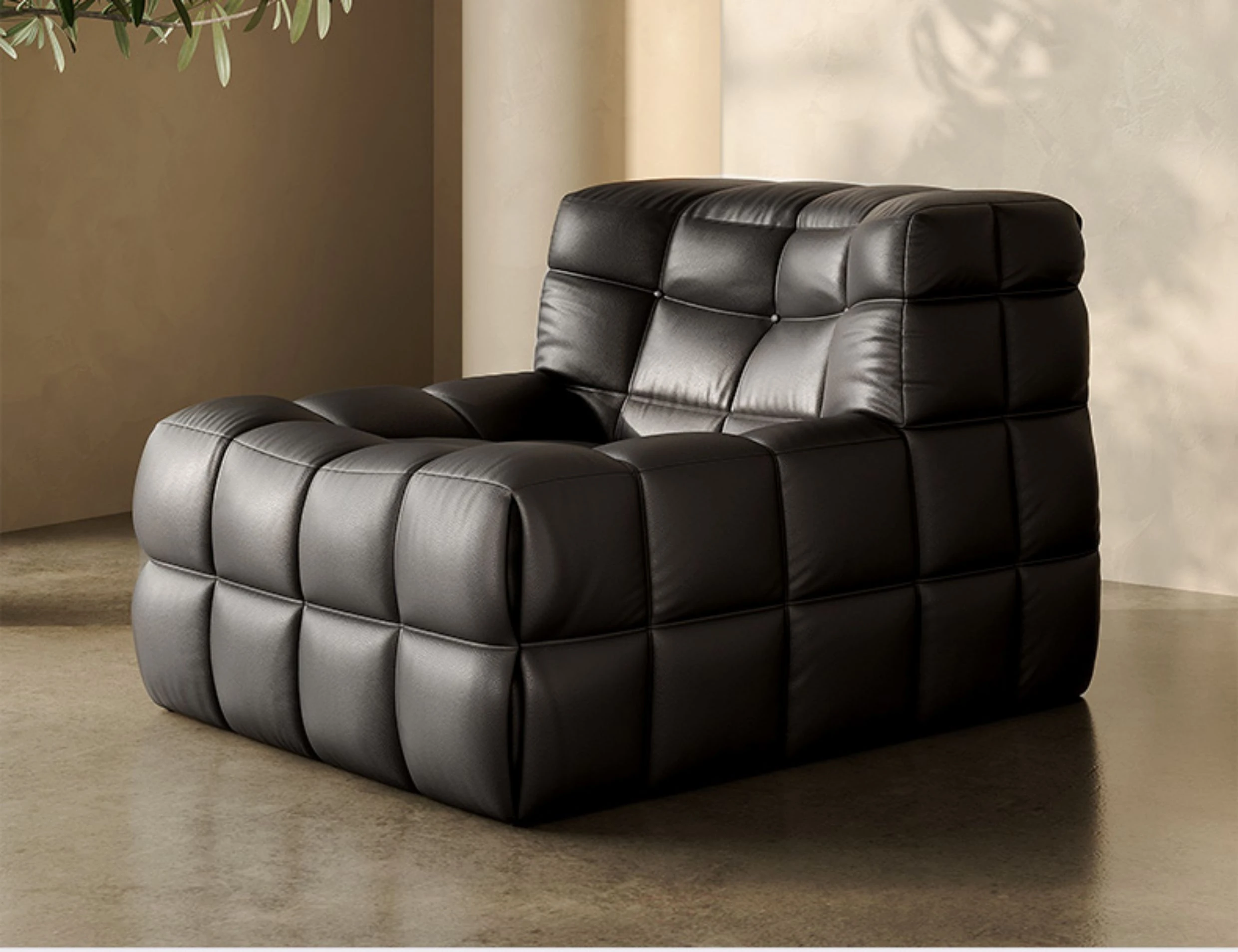 ワッフル鹿島のリクライニングソファ、寝れる!イタリアンラグジュアリーのミニマルデザイン、真皮の一人用ソファ。ふわふわのキューブ型、リラックスしたいあなたにぴったり!