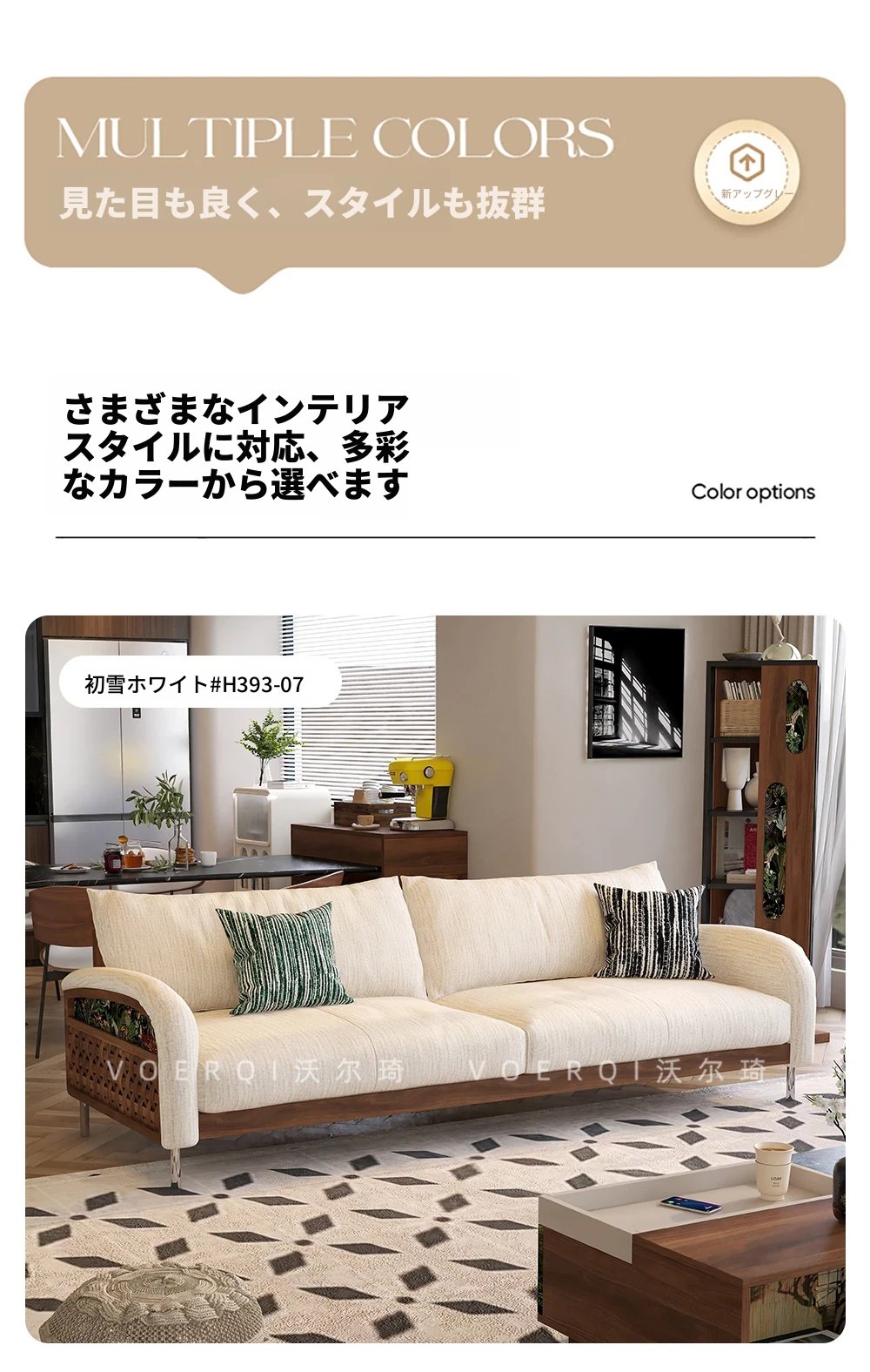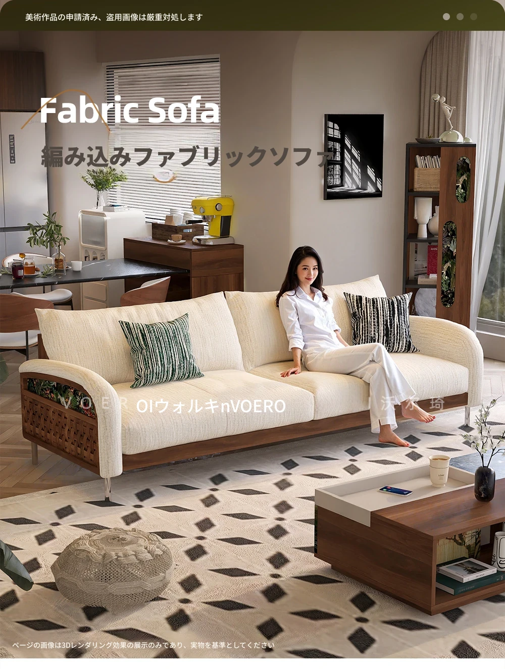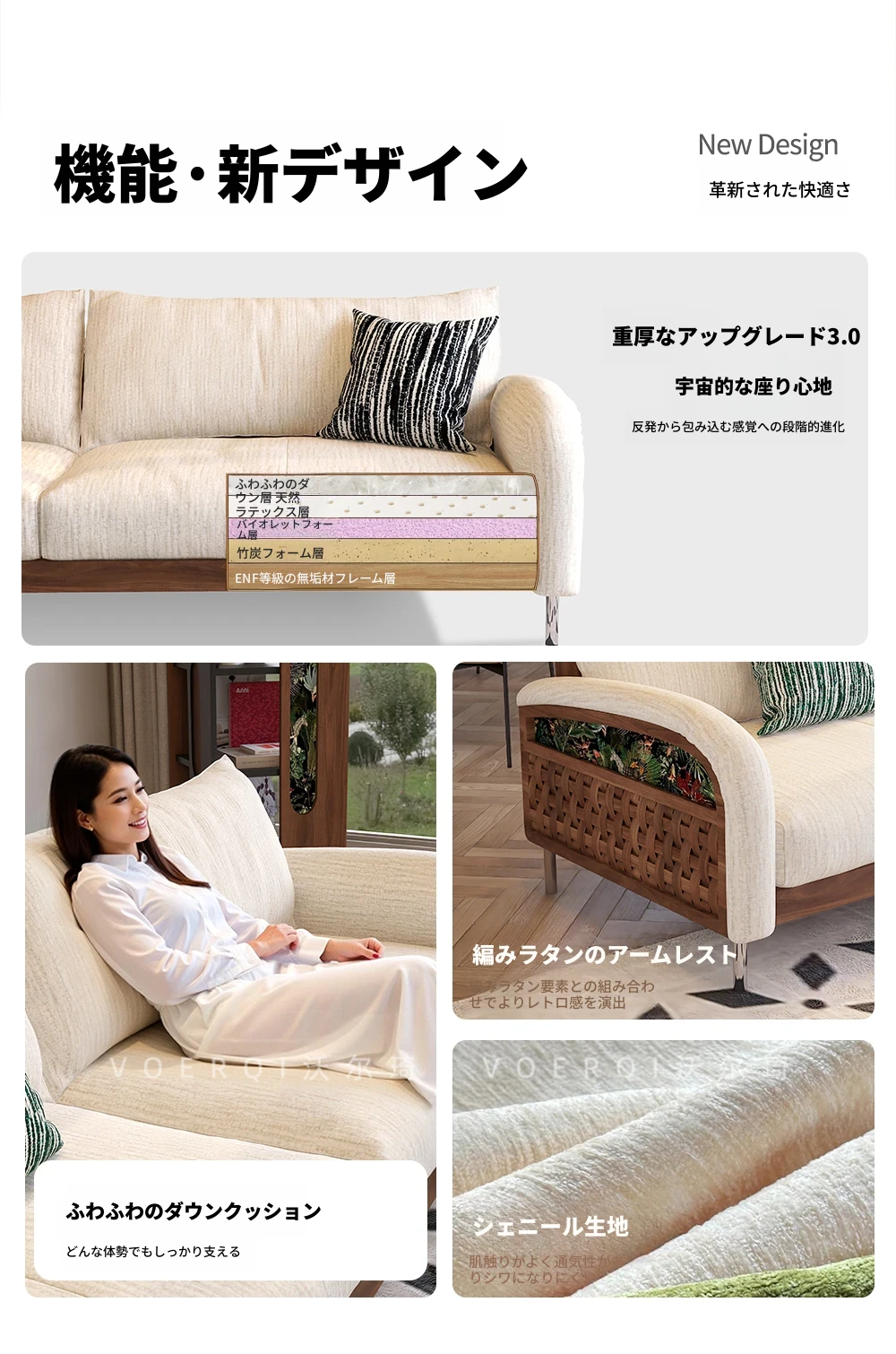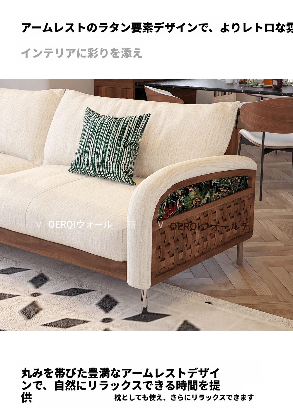 ウォルキーニャ・シェニールソファ フレンチクリームスタイル モダンミニマル 小型住宅向け レトロデザイン 藤編みと無垢材のリビングソファで、優雅な空間を演出!