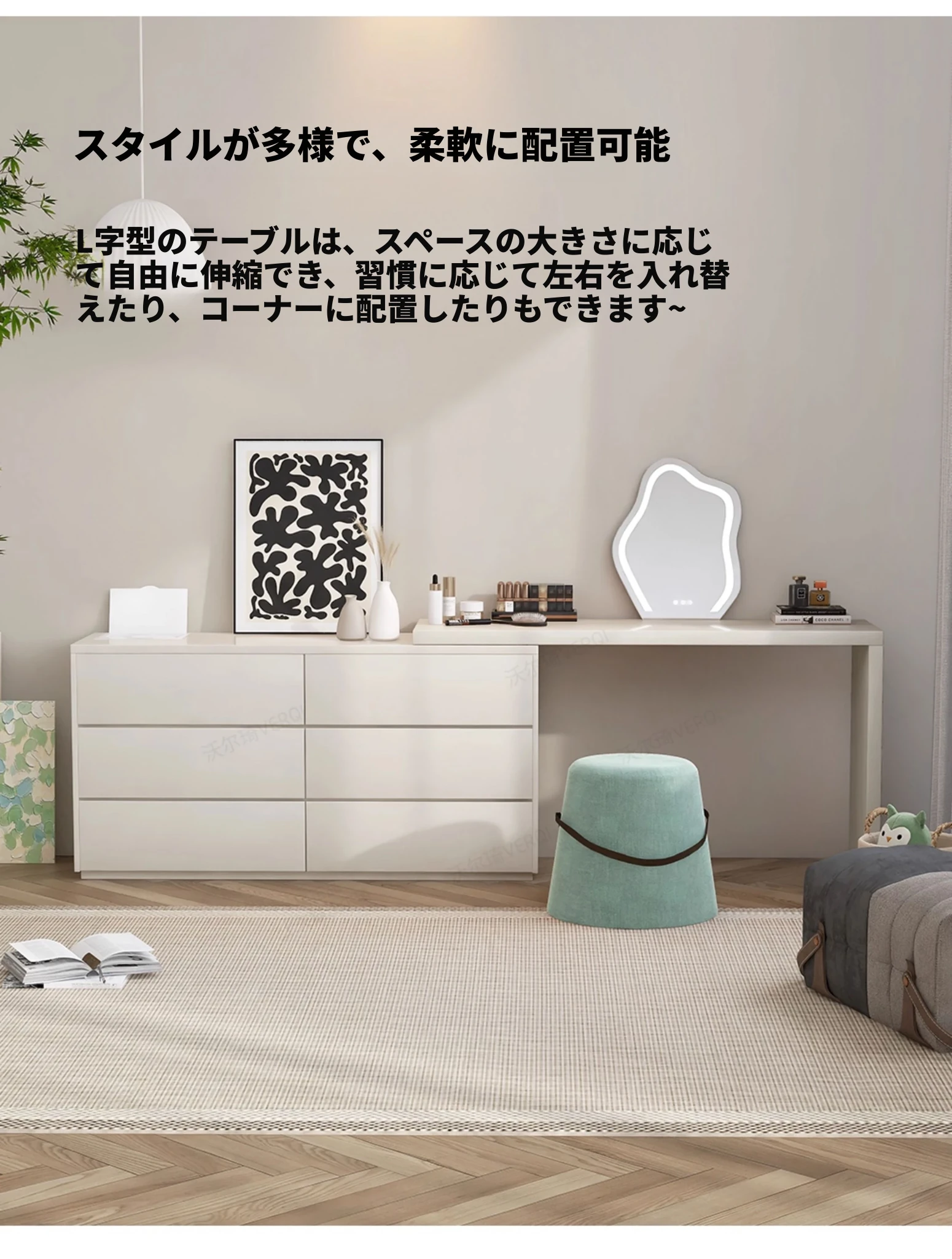 【2.4m六引き出しキャビネット】ドレッサー+雲の鏡+円形スツール+フェイスマスクボックス