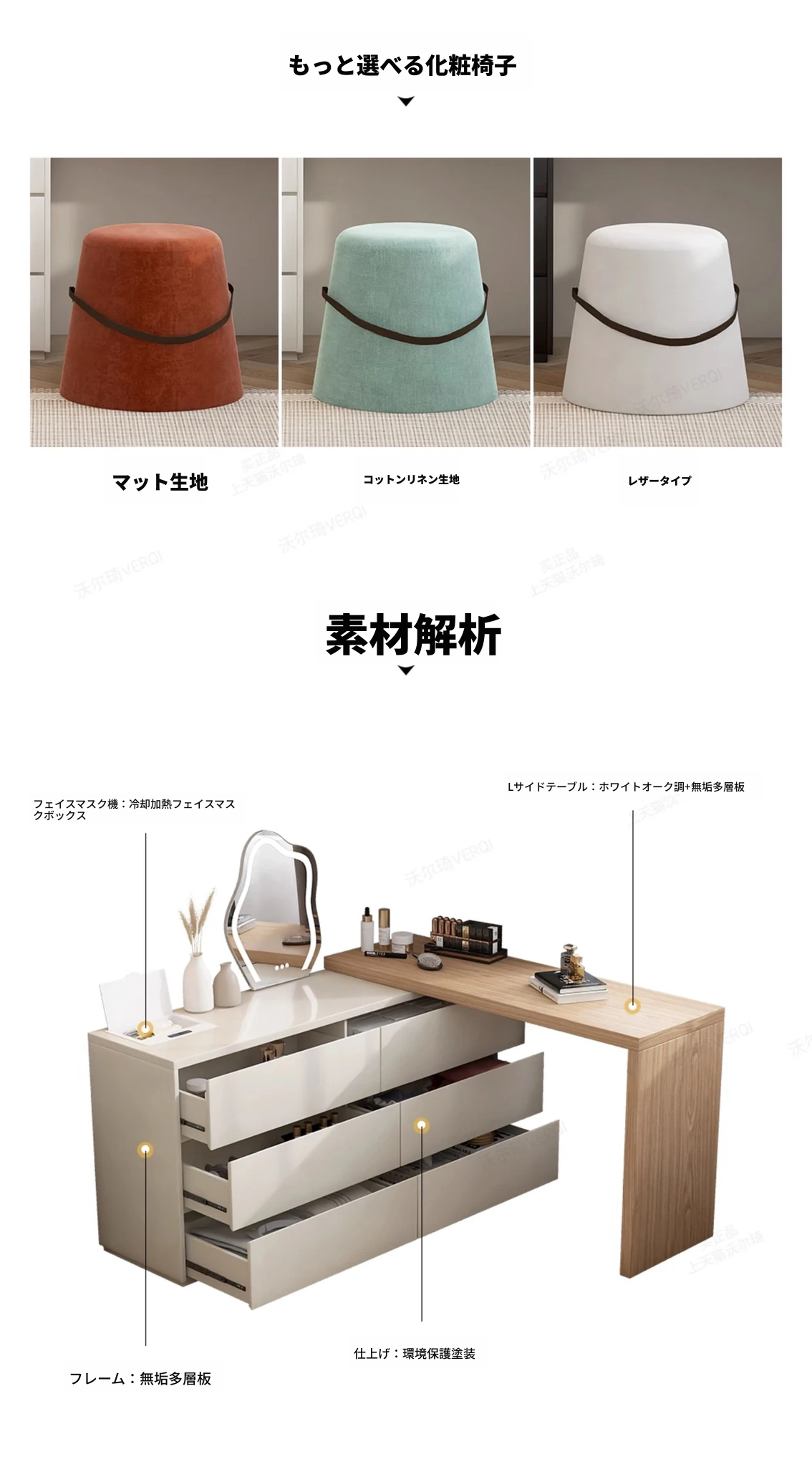 【2.4m六引き出しキャビネット】ドレッサー+雲の鏡+フェアリー椅子+フェイスマスクボックス