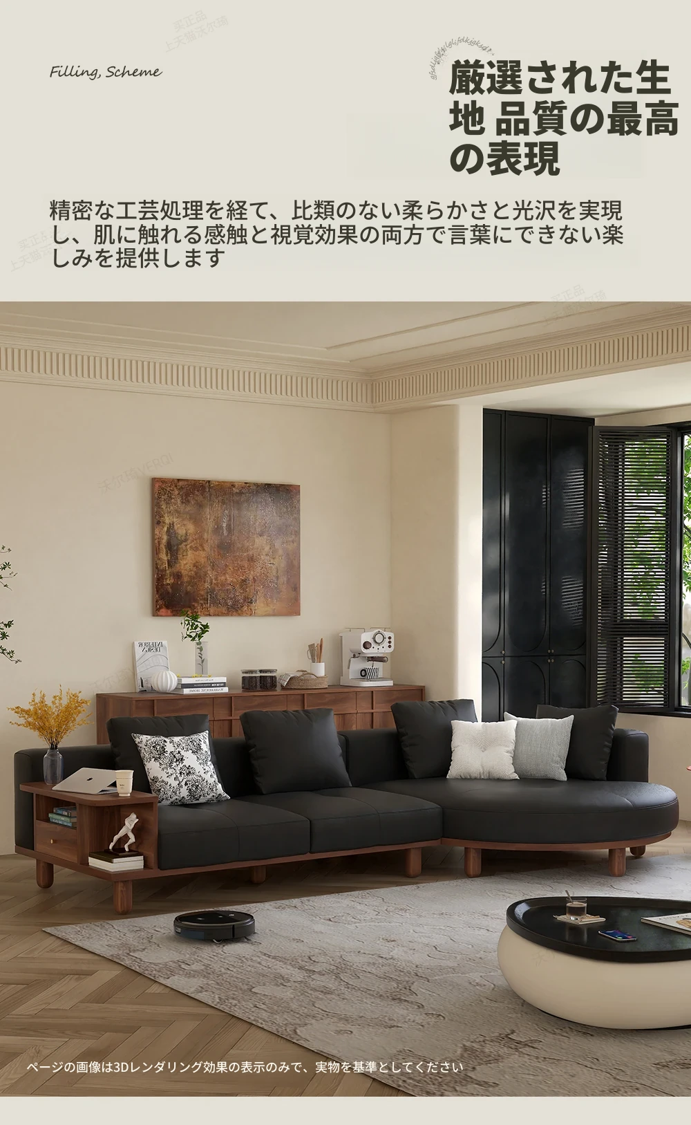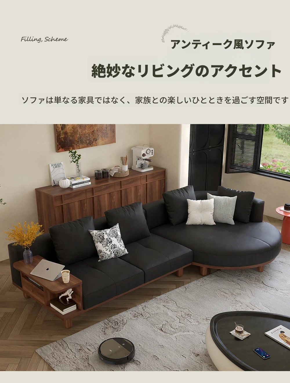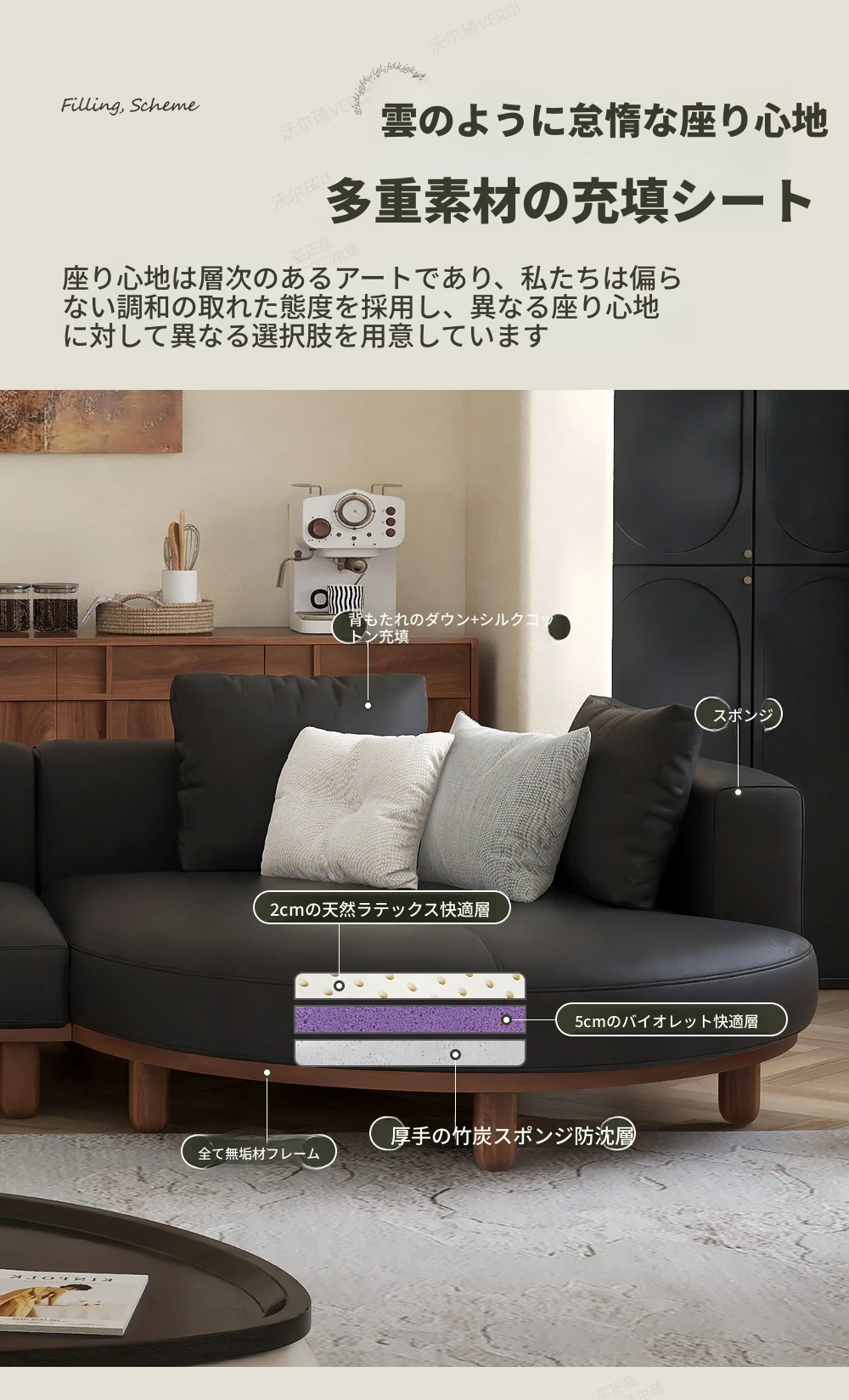 ウォルキ・コナリーの無垢材ソファ、レトロな別荘スタイルのリビングにぴったり!ラウンド型の貴婦人ソファ、アーチ形コーナー、ヴィンテージ風の本革仕上げで贅沢な安らぎを提供します。