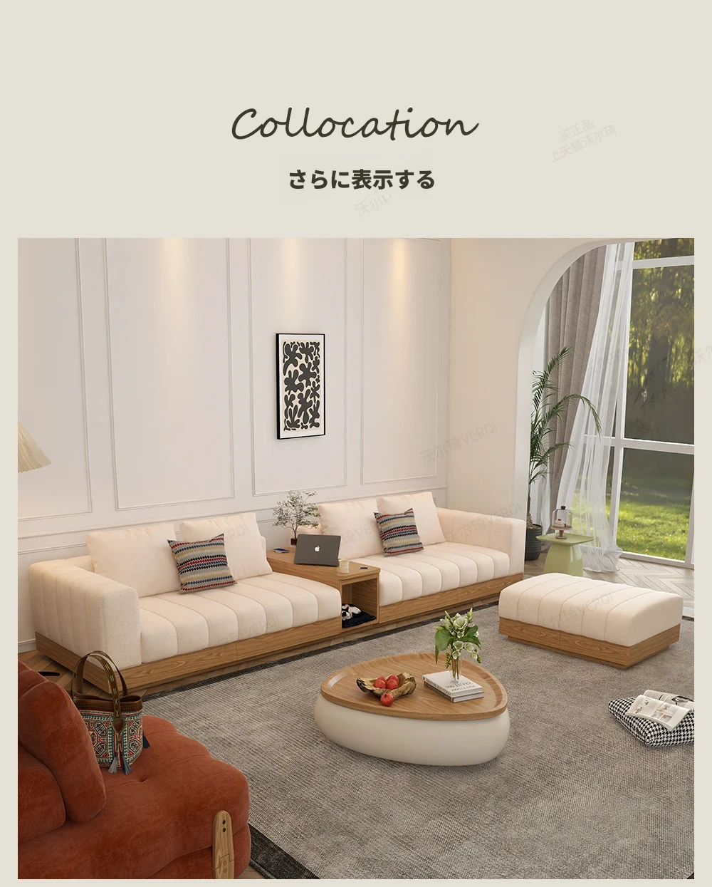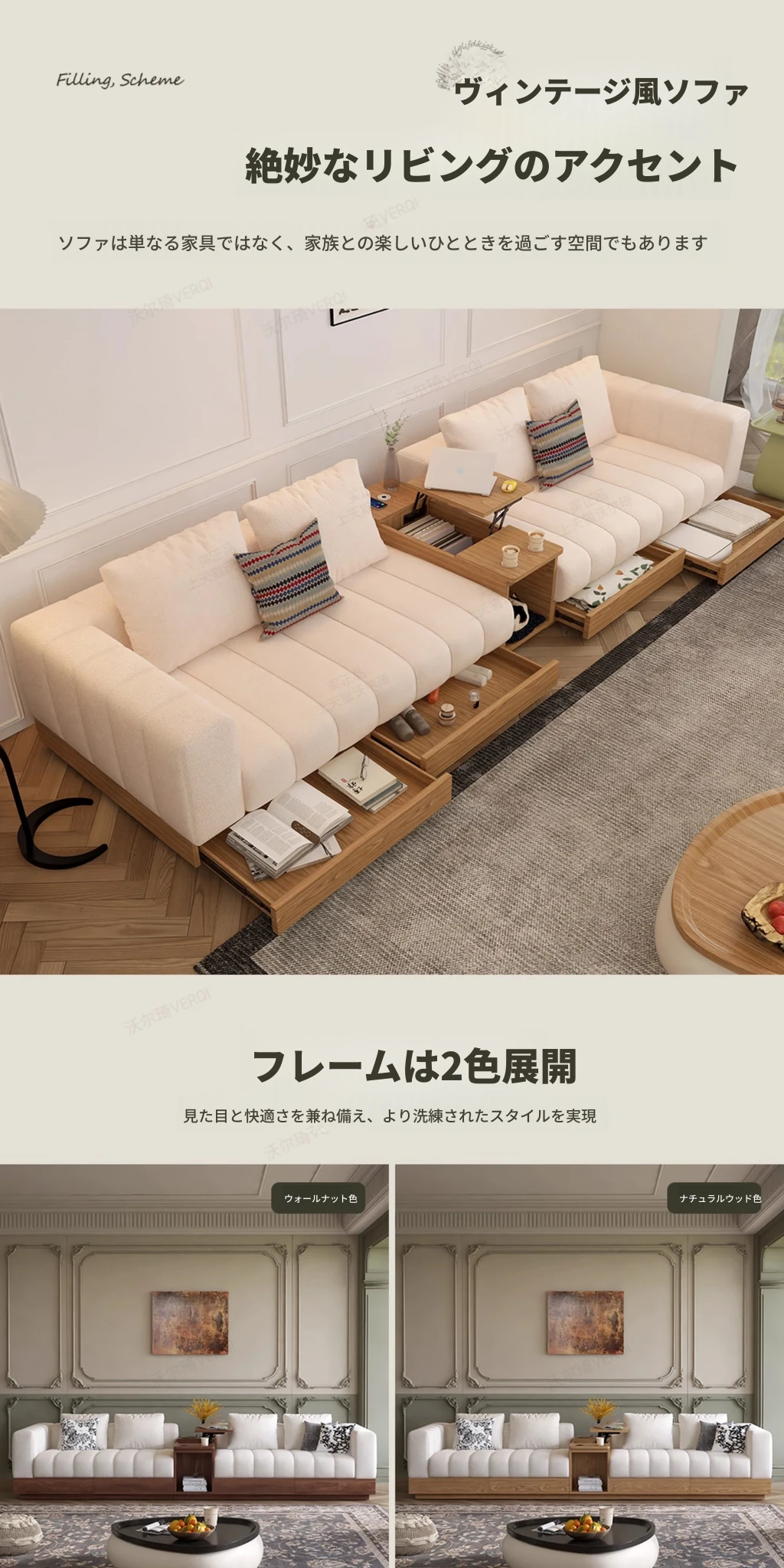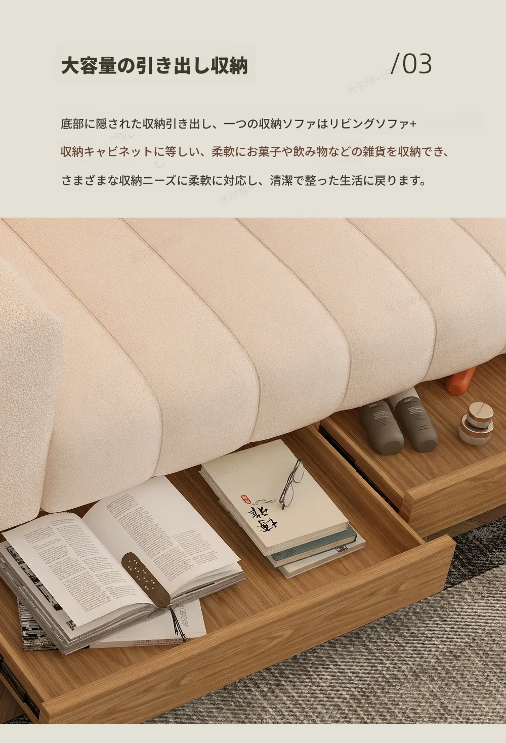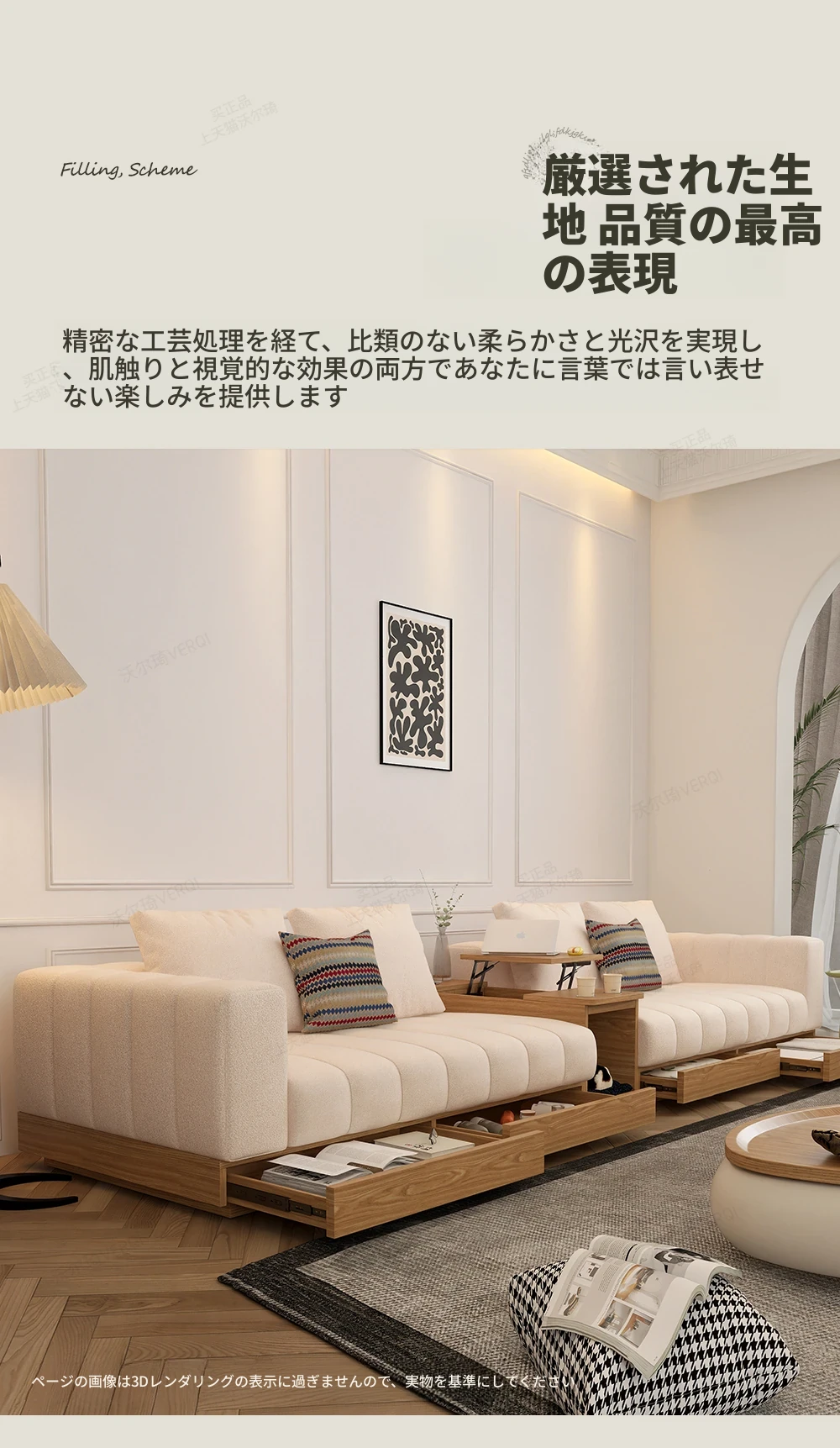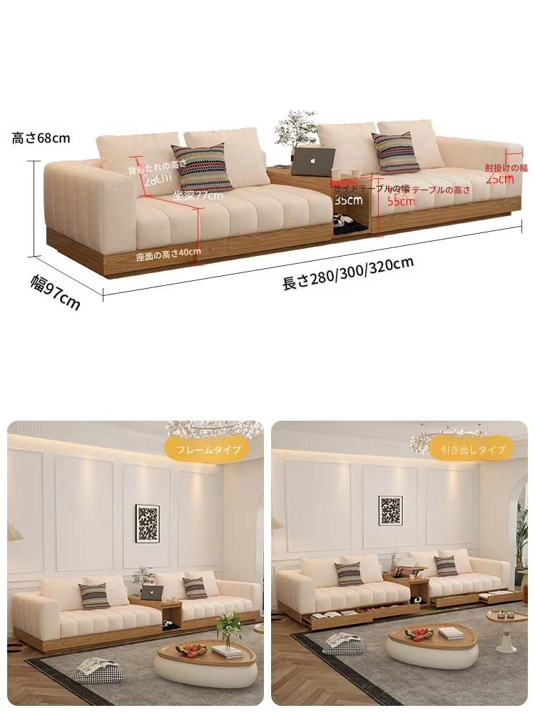 ウォルチクリーム原木風ピアノ鍵ソファー - リビングにぴったりな和風北欧スタイル、機能的な収納スペースを備えた天然木製布製ソファ!心地よい空間を演出します。