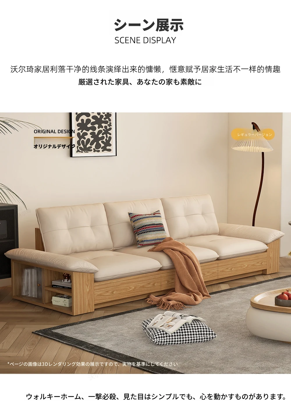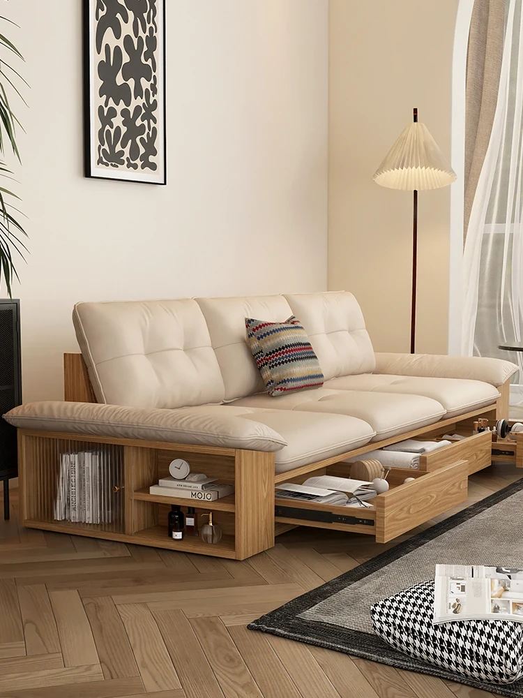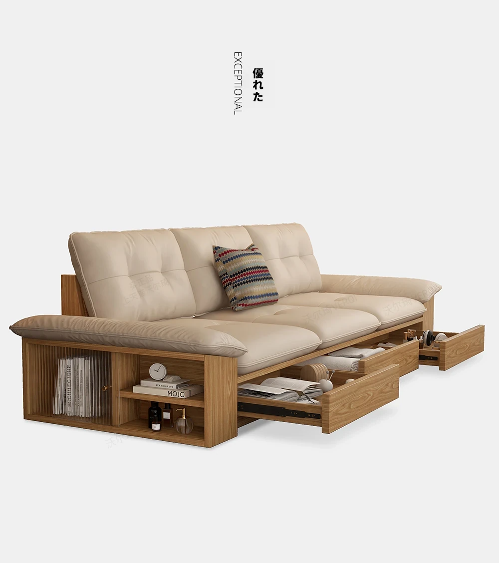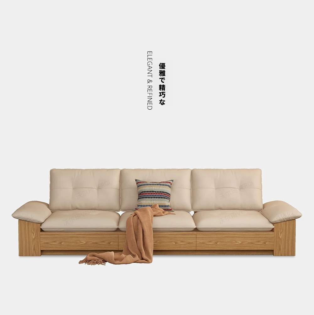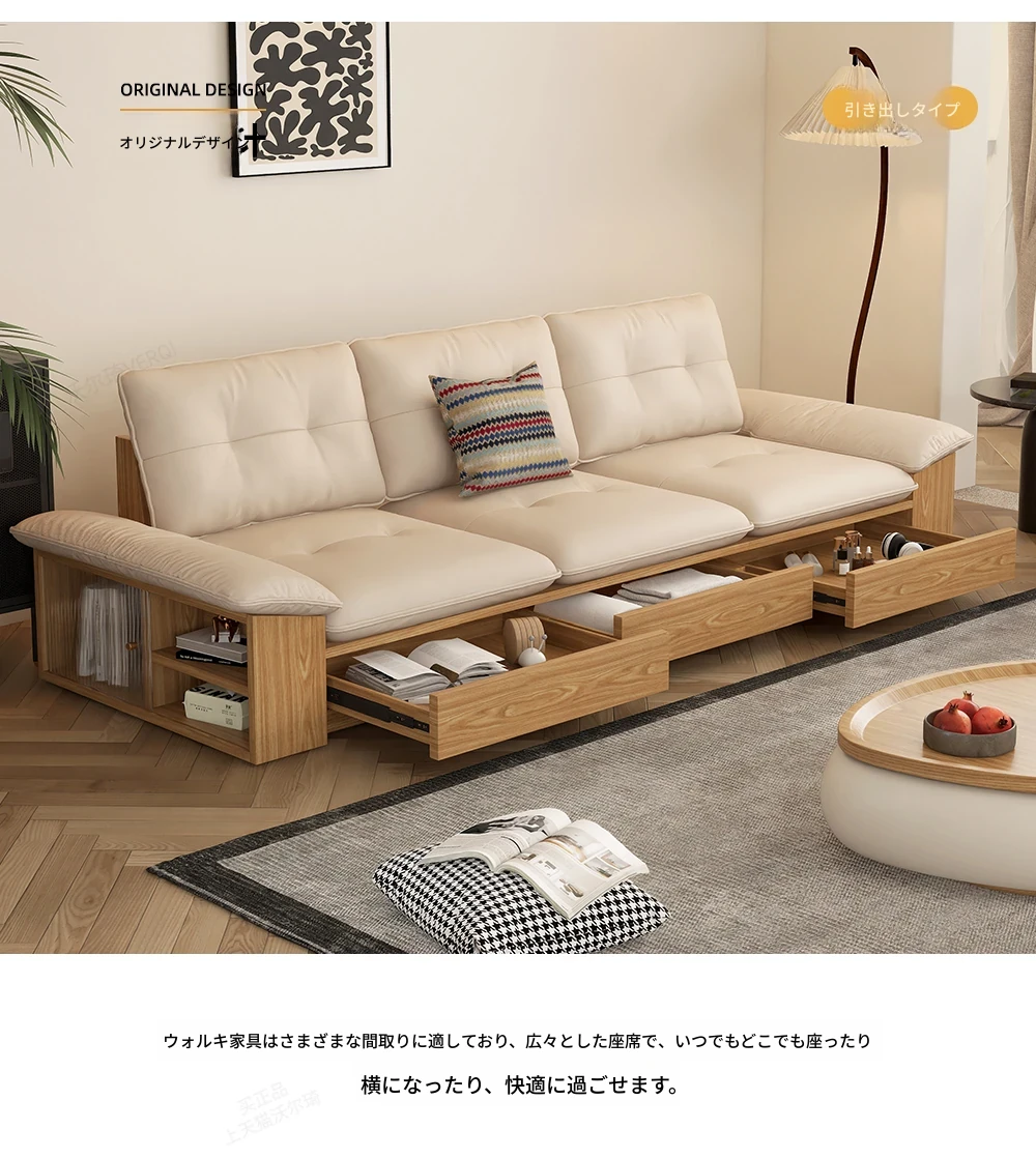 ウォルキ真皮ソファ 北欧・和風デザインの天然木製 小型リビングに最適!クリーム色のナチュラルウッド風収納付きピクセルレザーソファで、おしゃれな空間を演出。快適さとスタイルを両立させた一品です!