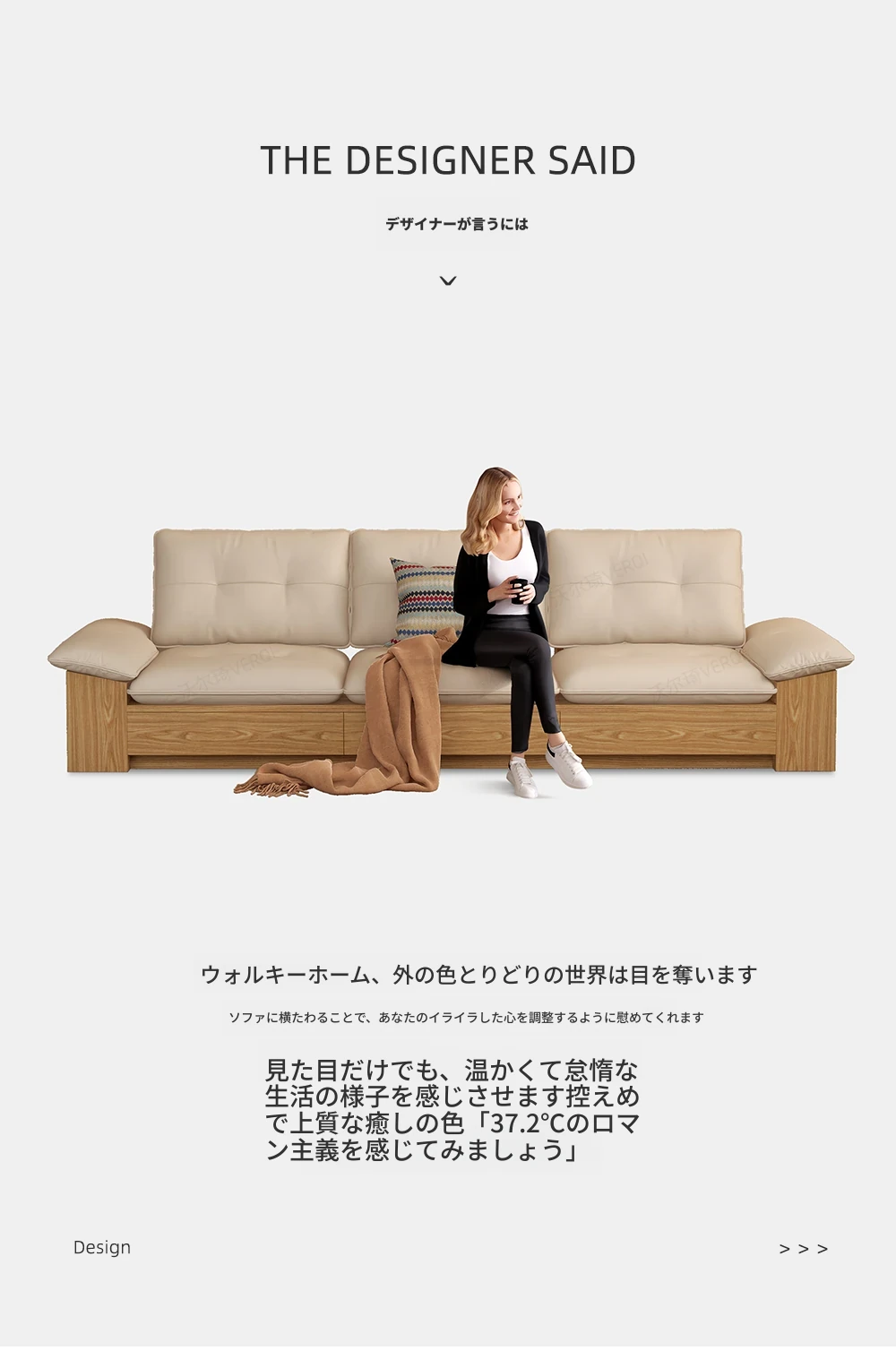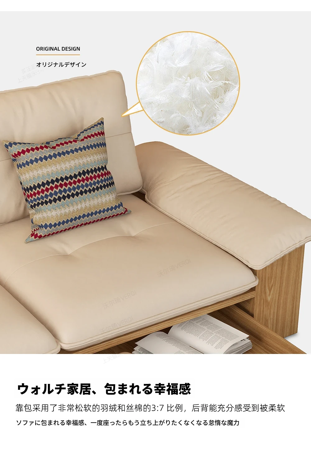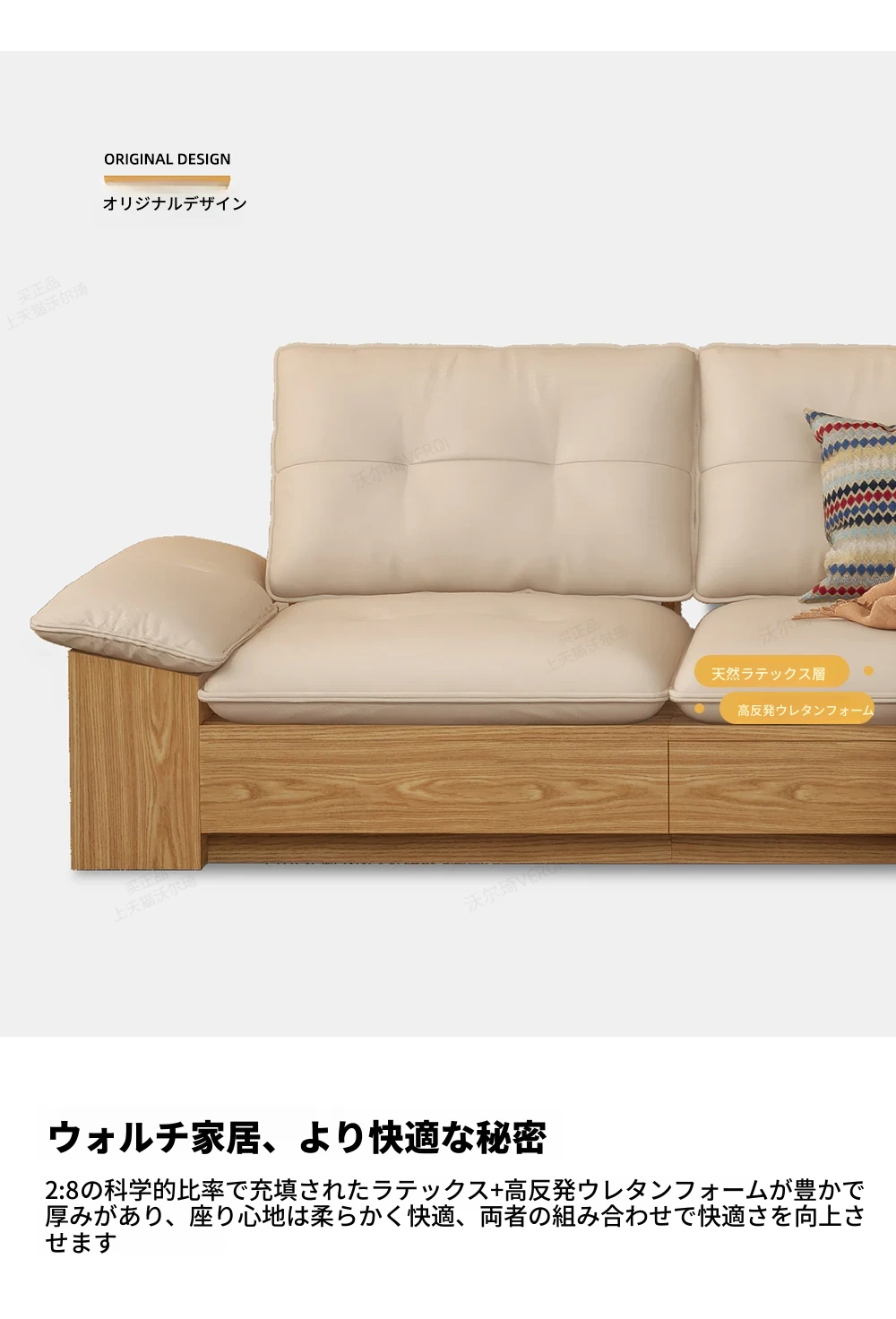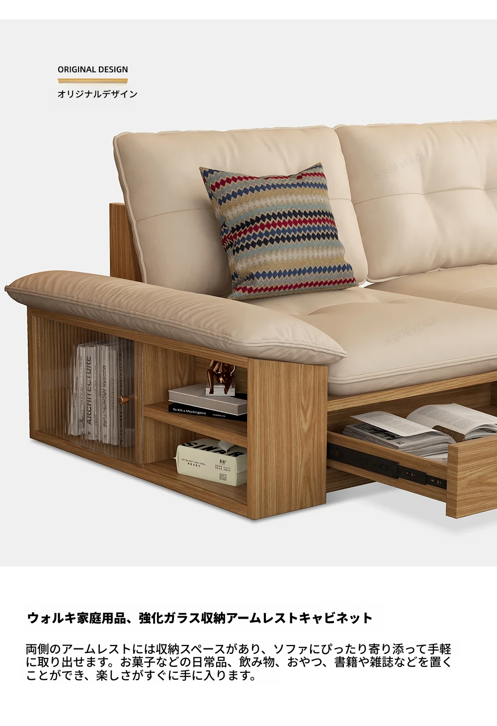 ウォルキ真皮ソファ 北欧・和風デザインの天然木製 小型リビングに最適!クリーム色のナチュラルウッド風収納付きピクセルレザーソファで、おしゃれな空間を演出。快適さとスタイルを両立させた一品です!