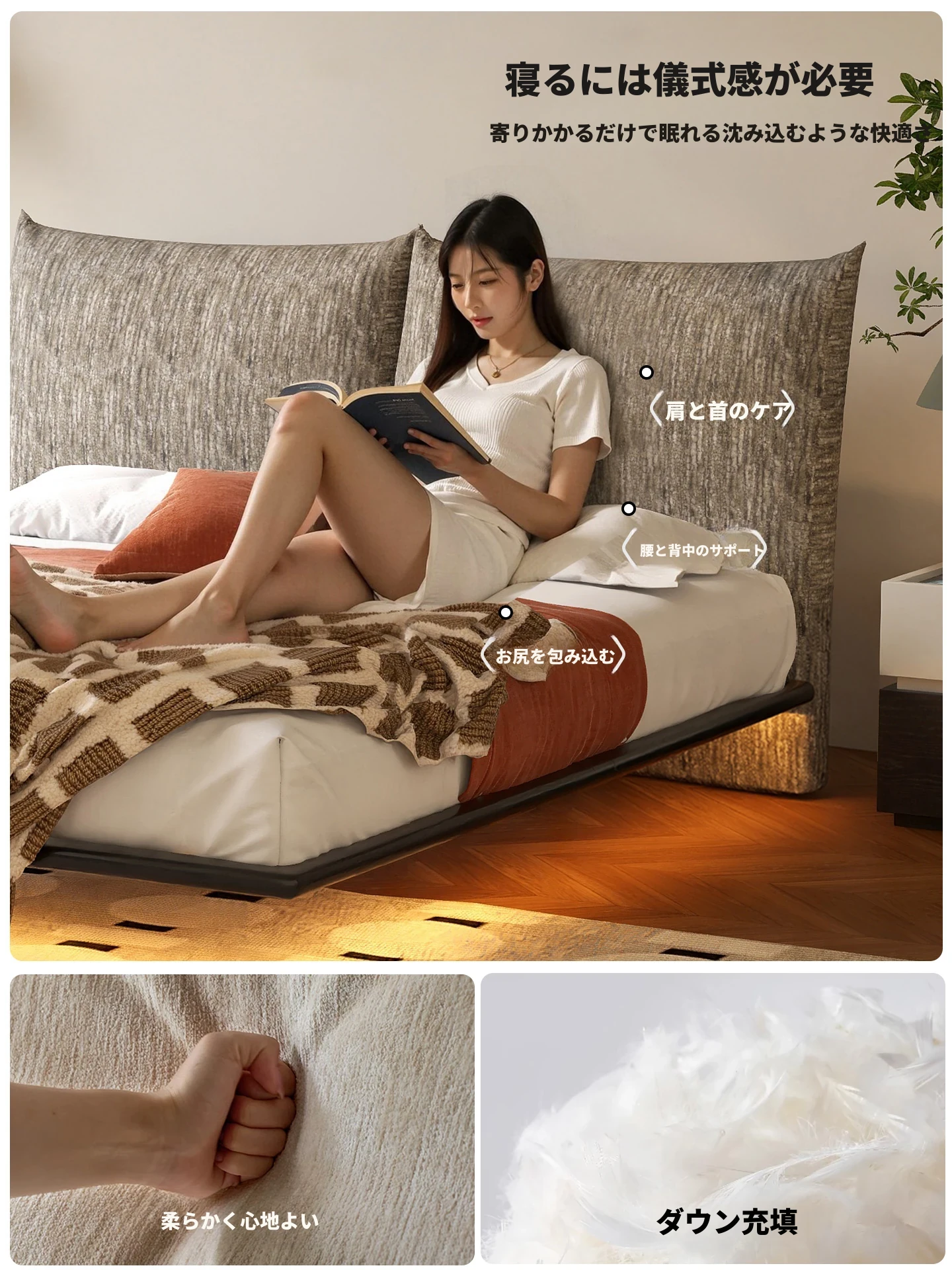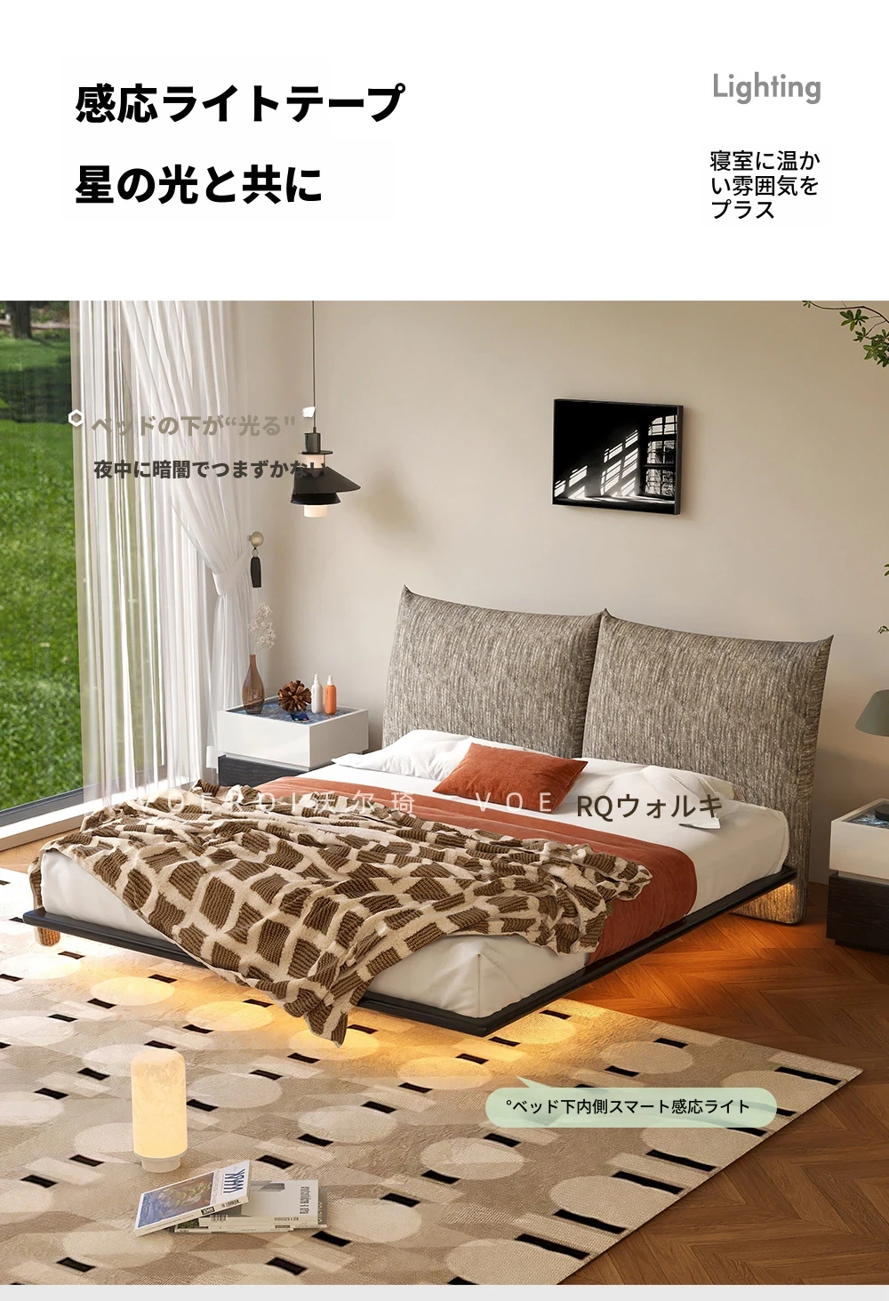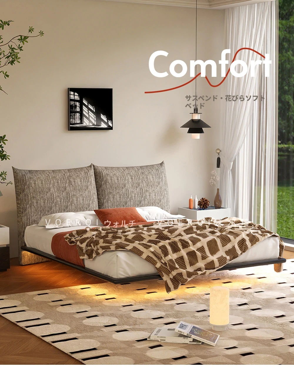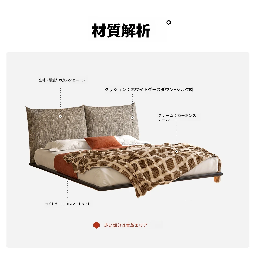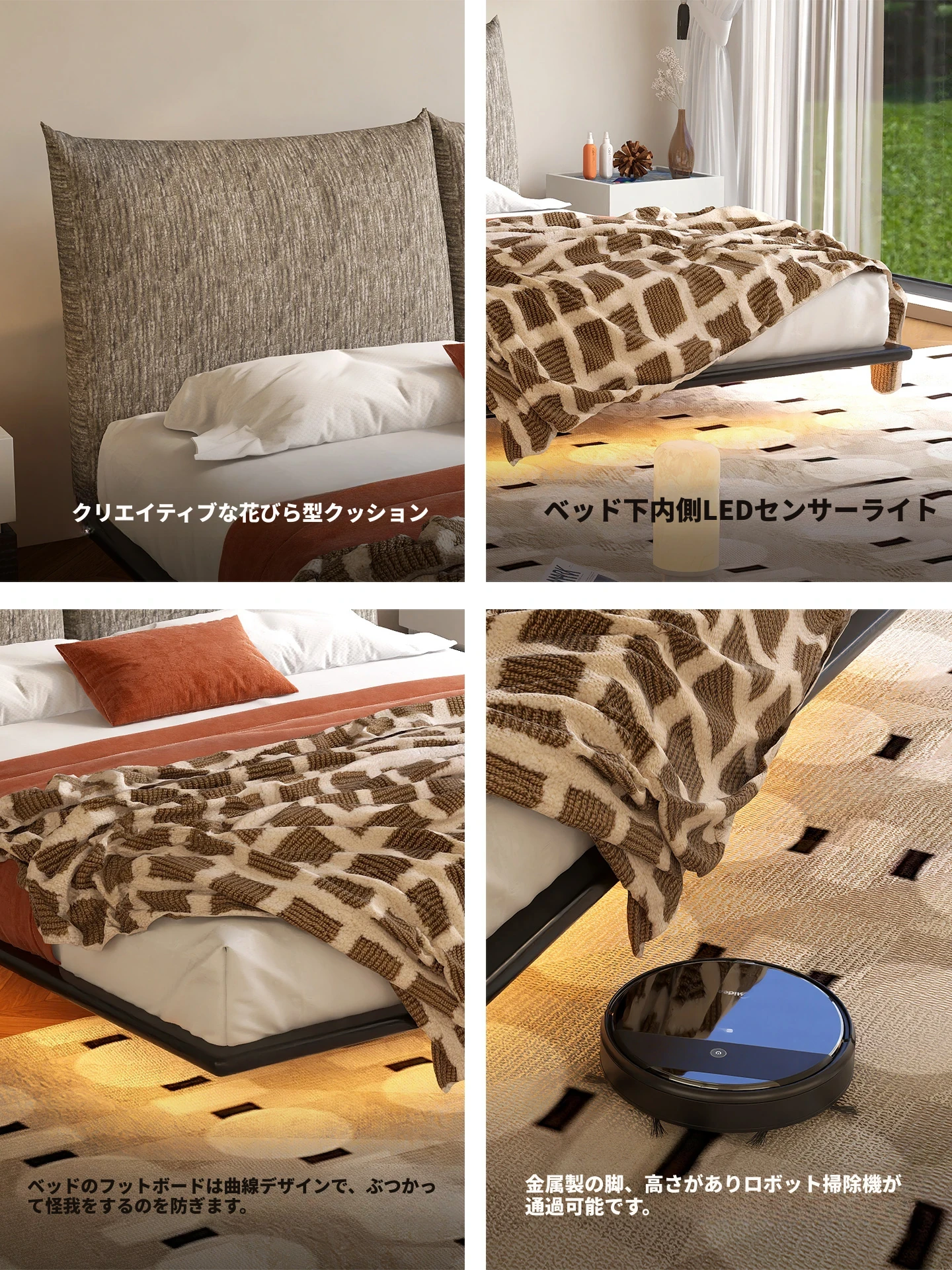ウォルキーフレンチラグジュアリー シェニール花びらベッド ファブリック シンプルなダブル 不銹鋼薄型ヘッドボード 浮遊型ベッドで、優雅な寝室空間を演出!