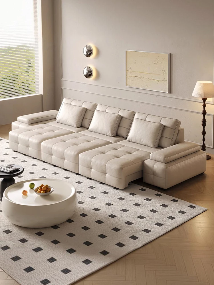 紅昇クリーム風リビング電動ソファ - 高級本革使用、イタリアンシンプルデザイン、伸縮機能搭載!快適なリビング空間を実現するあなたのためのソファです。