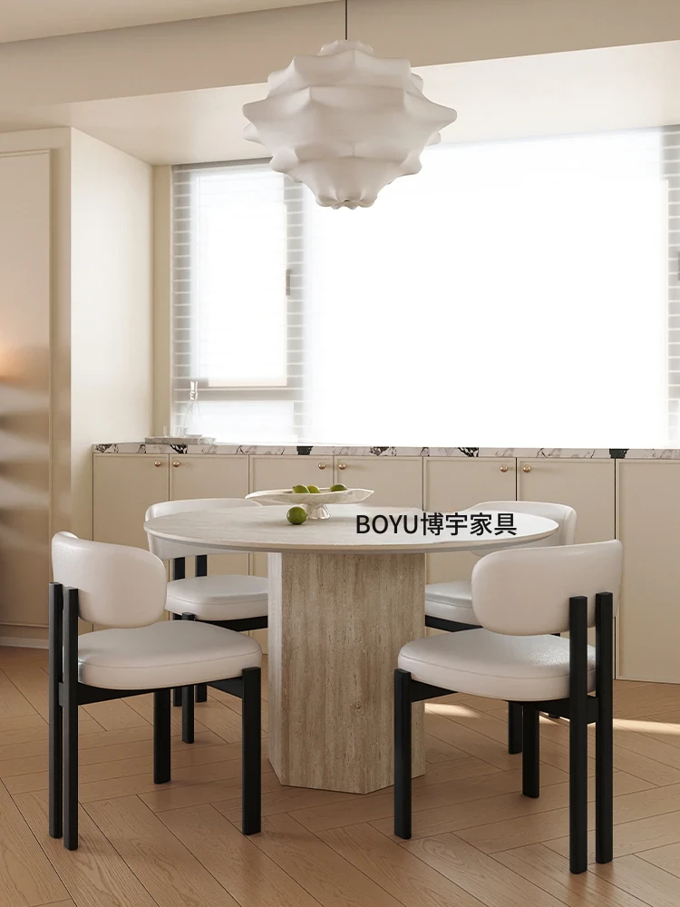 博宇家具の洞石岩板を使用したモダンでシンプルな円形ダイニングテーブルとチェアのセット。小さなスペースにもぴったりなスタイリッシュなデザインで、静かな雰囲気の中で食事を楽しめます。